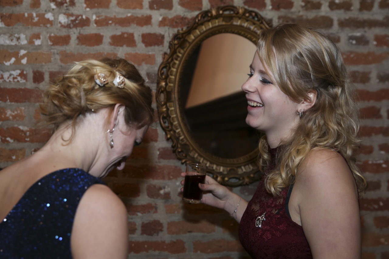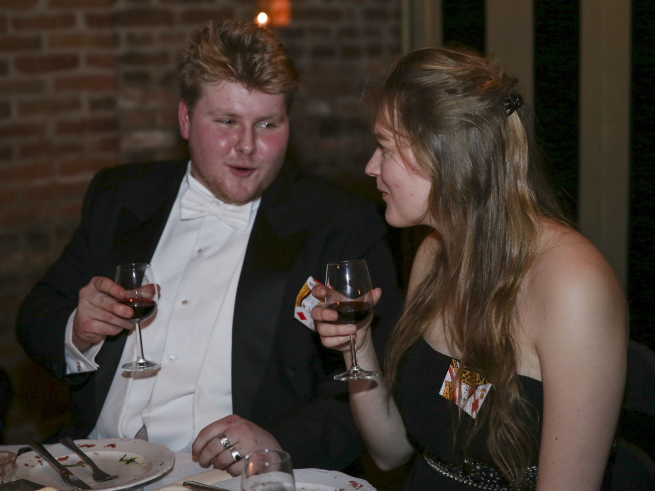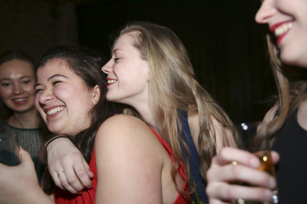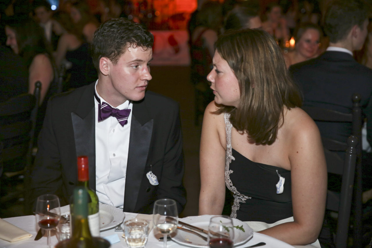 It remains to be seen whether dress length is indeed a predictor of outcome. Be that as it may, the beautiful long dresses of the ladies immediately catch the eye during the first tour of the dining room, where the sixty students are enjoying – very quietly, it must be noted – a three‑course dinner. The attire of the ladies makes it possible for a few gentlemen to immediately distinguish themselves as knights in shining armour. “My dress is ten centimetres too long”, Jojanneke explains while her date Toine sits next to her on the ground with a handful of safety pins. “Fortunately, he’s come to my rescue.”
