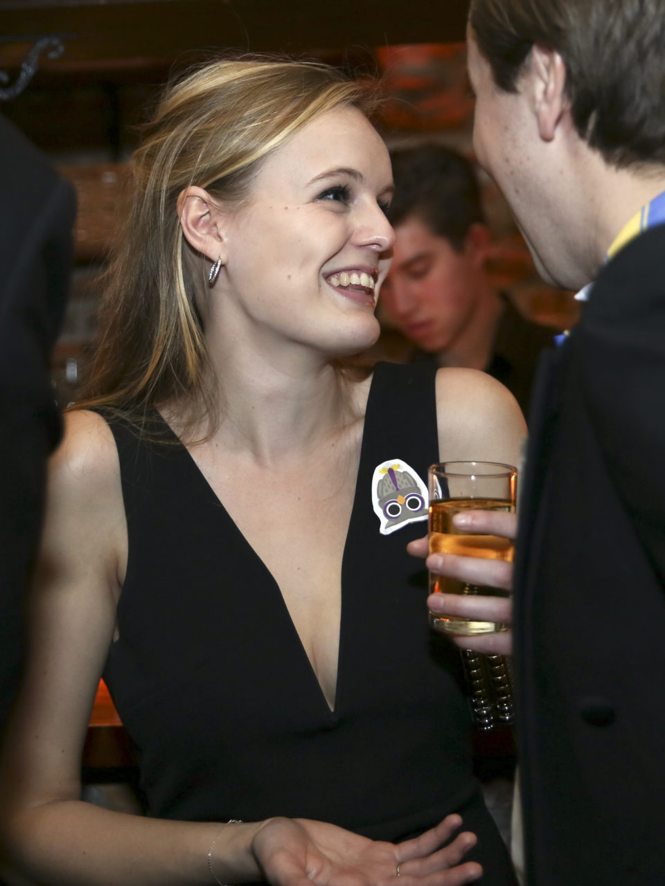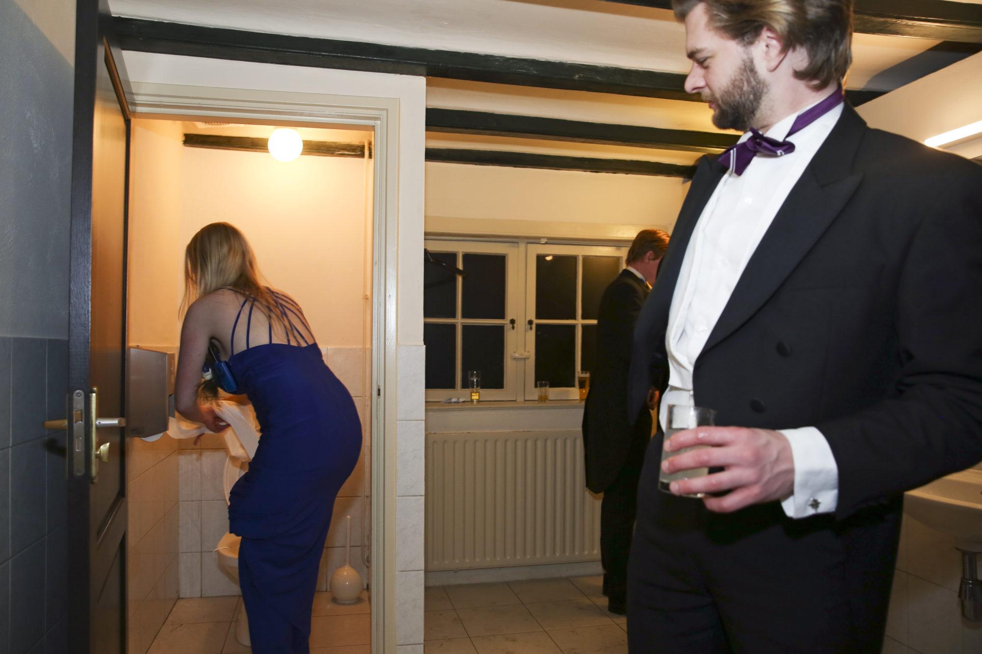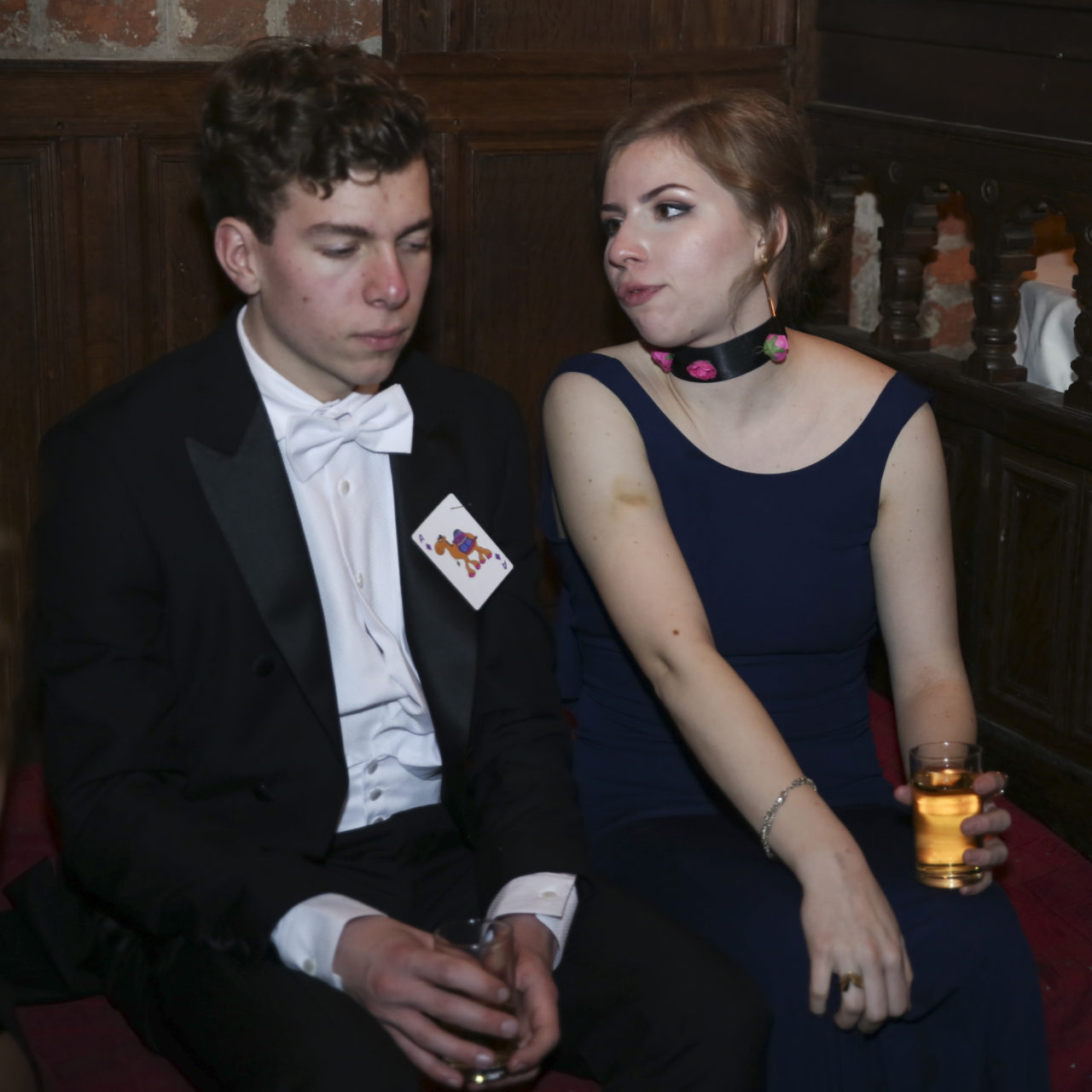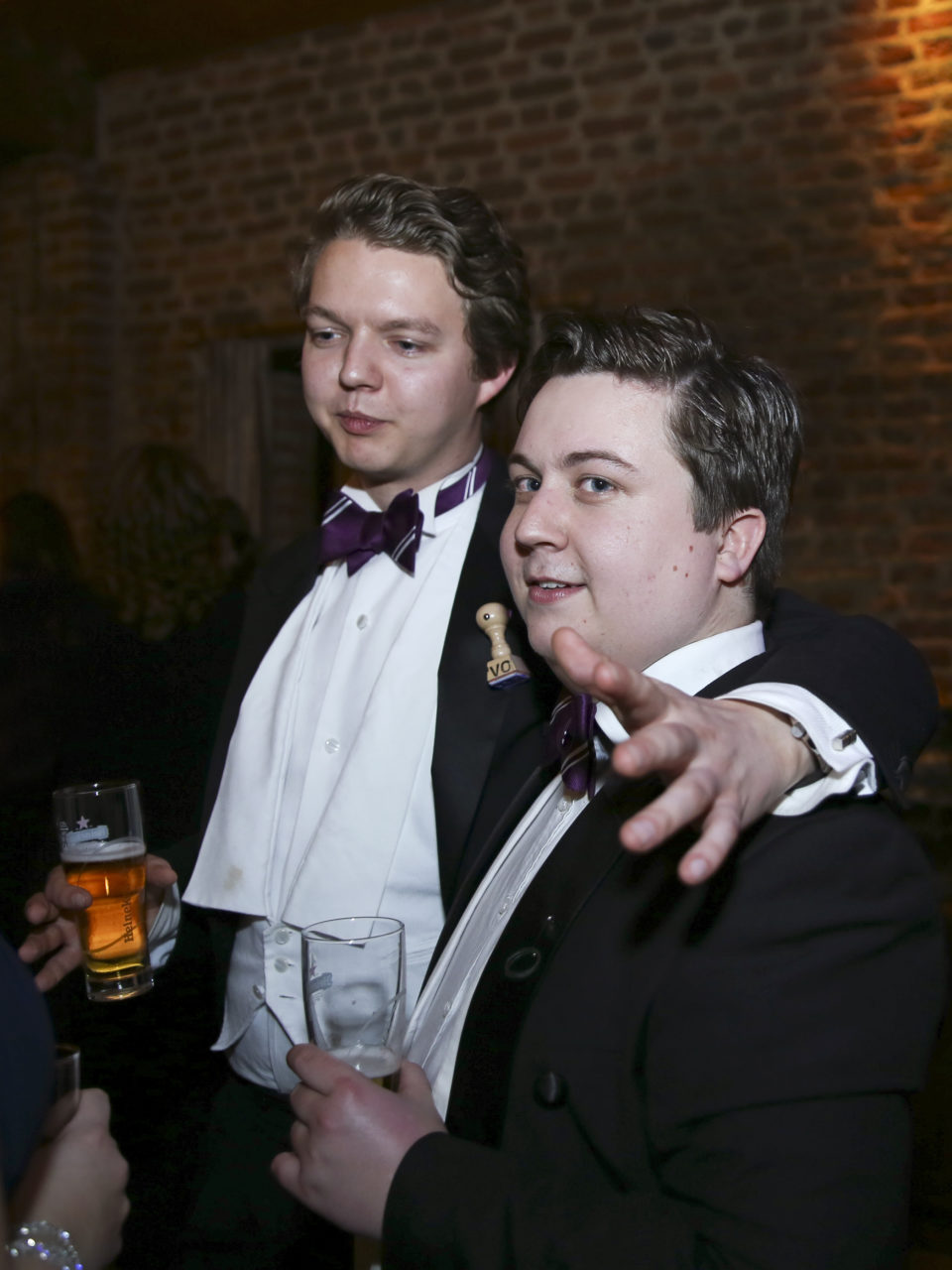 When everyone goes to the other room after dinner and the two hundred evening guests arrive, another clothing detail catches the eye: the identical ornaments that the dates have pinned to each other’s chests. It is part of the gala’s extensive dating ritual. Karlien explains that “dates can always recognise each other and everyone knows who is with who. There’s sometimes an entire history behind the ornaments – a story about how the dates met or about something that they’ve been through together. But they can also just happen to have been readily available.” The chest ornaments rang from toy excavators (“I just happened to have them at home”) and Gamma discount cards (“we both work there”) to USB sticks (“she always forgets everything”) and Flügel bottles (“good to have something to drink with you in case the evening goes flat”).
