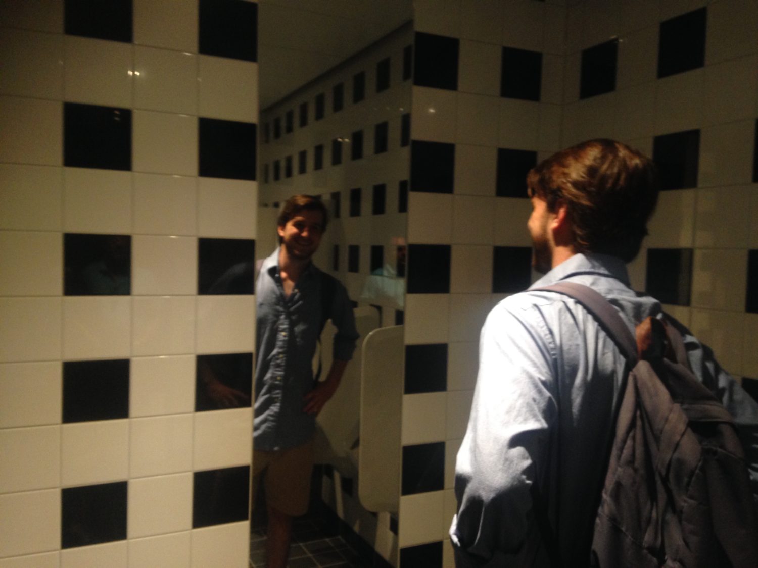 After a couple of cappuccinos, my bladder has reached maximum capacity. Time for my first trip to the WC of the new library. In there, I find Pietro Vigilanza checking himself out. While he combs his hair, he gives praise to the aesthetics.