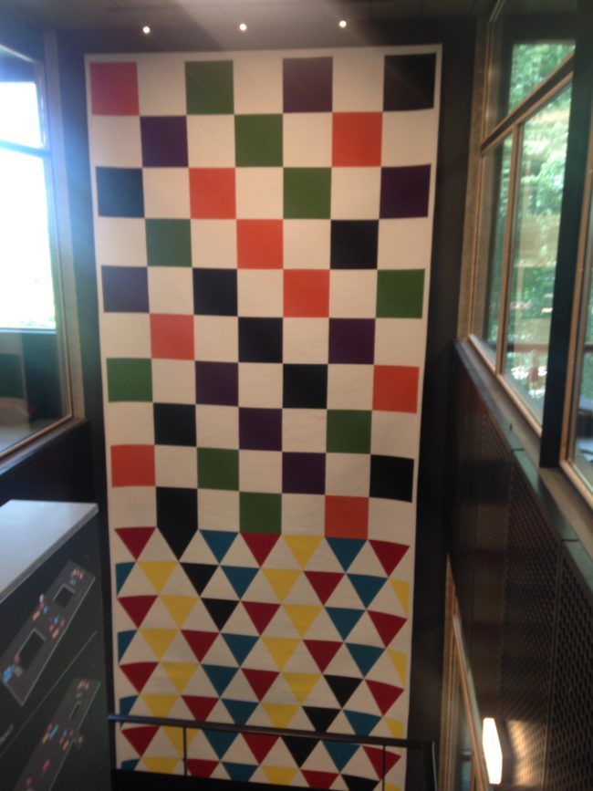 In the Erasmus Gallery, Koen Taselaar and Henri Jacobs have their art exhibition, JA TA TA JA, on display. Hanging above the staircases on both sides of the library are also tapestries also made by Jacobs. The colorful, geometrical interplay of the tapestry brings color to an otherwise bleak stairway.