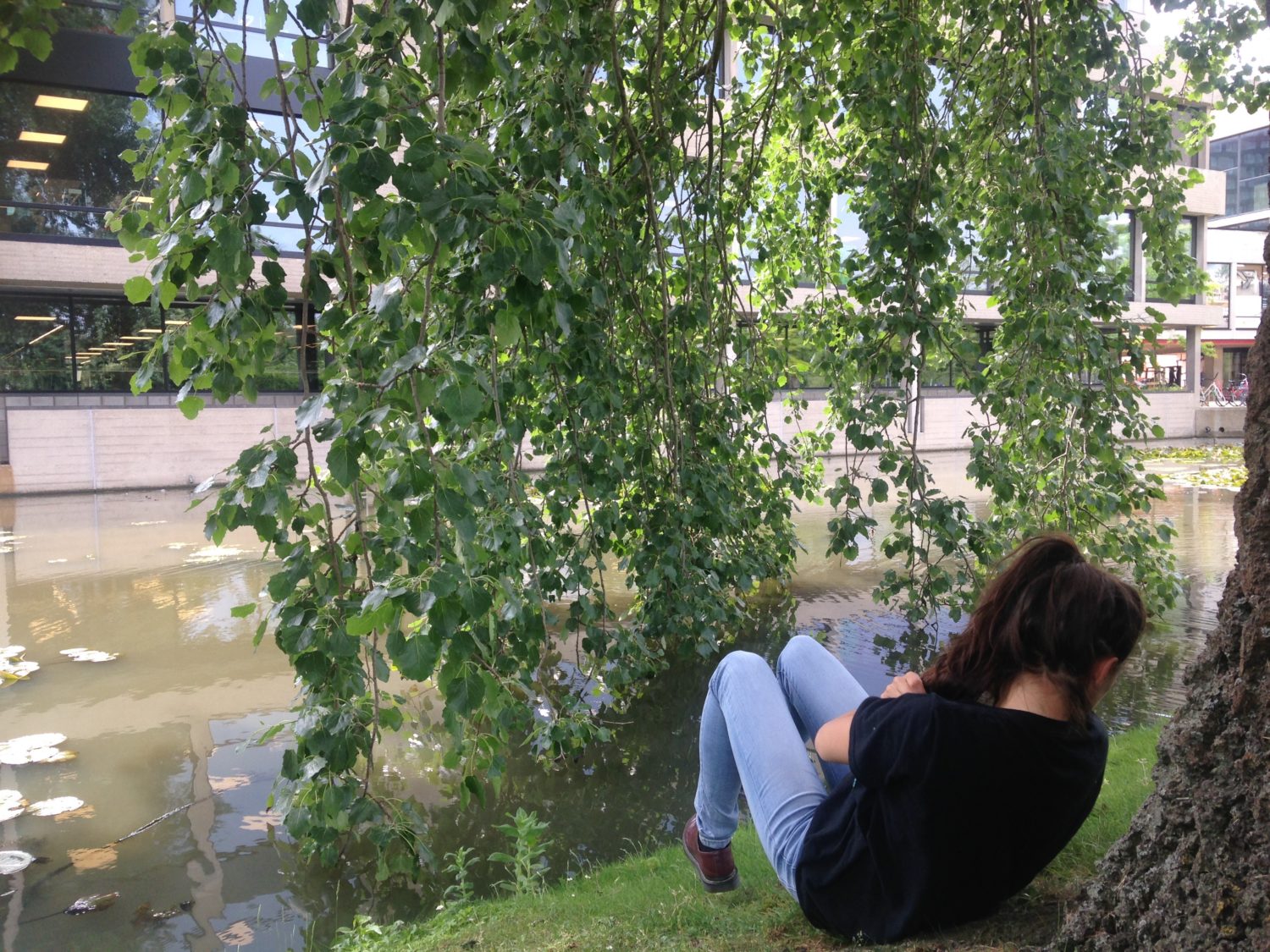 The sun has made its way through the clouds and is now beaming through the big windows of the building. Finding it a bit too hot for her own comfort, Natalia Derossi takes a break under the willows outside
