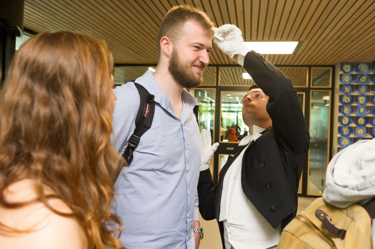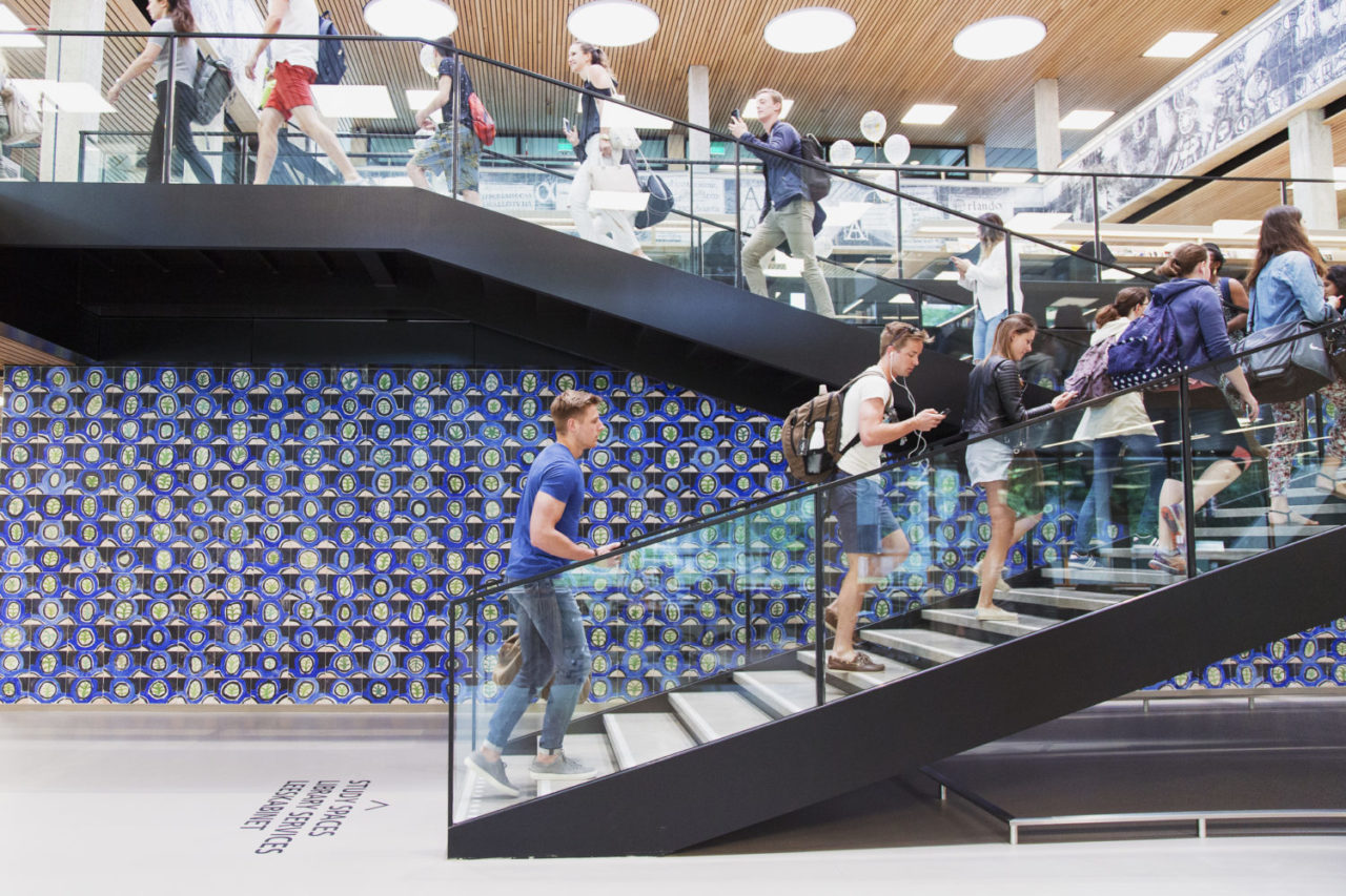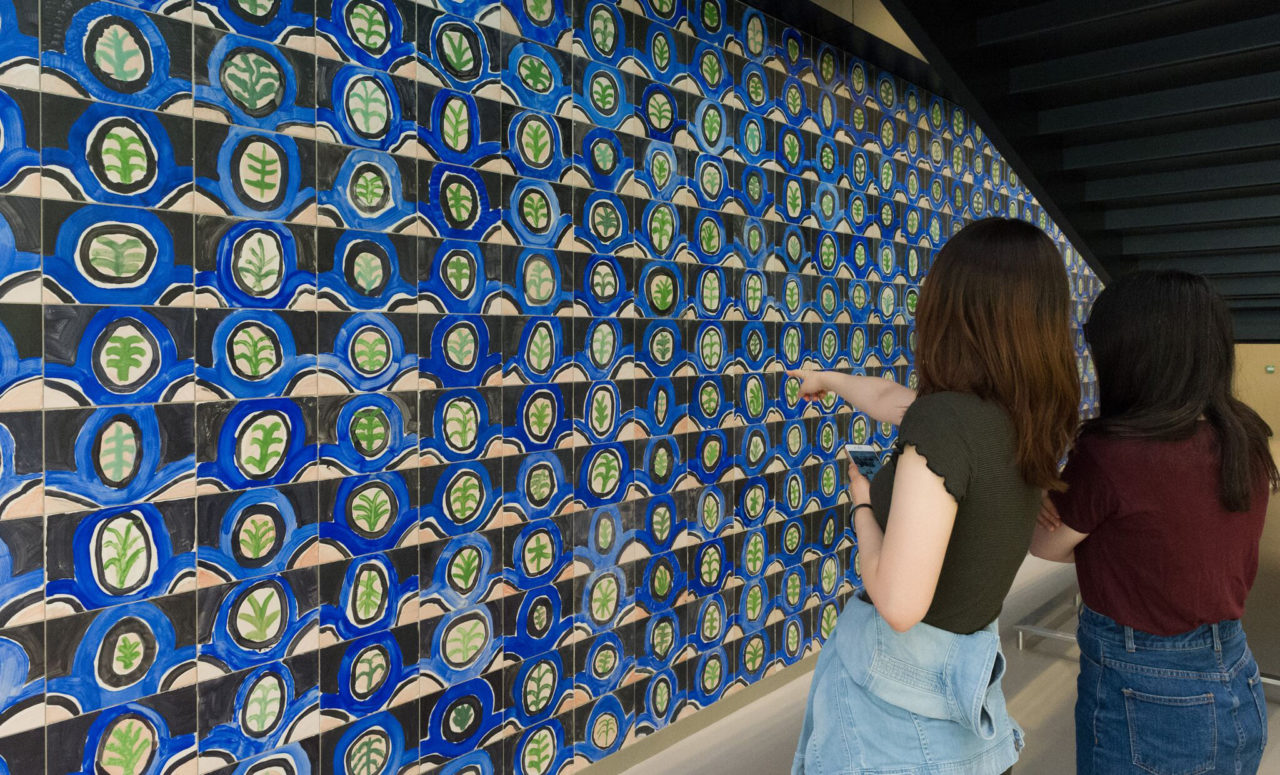In February, the Erasmus Gallery was turned into a temporary art studio where students and staff painted ceramic tiles in a certain blue-green pattern designed by artist Marijn van Kreij. After ten days, around a thousand tiles were made. Now all those tiles form a mural that greets those who enter the library.