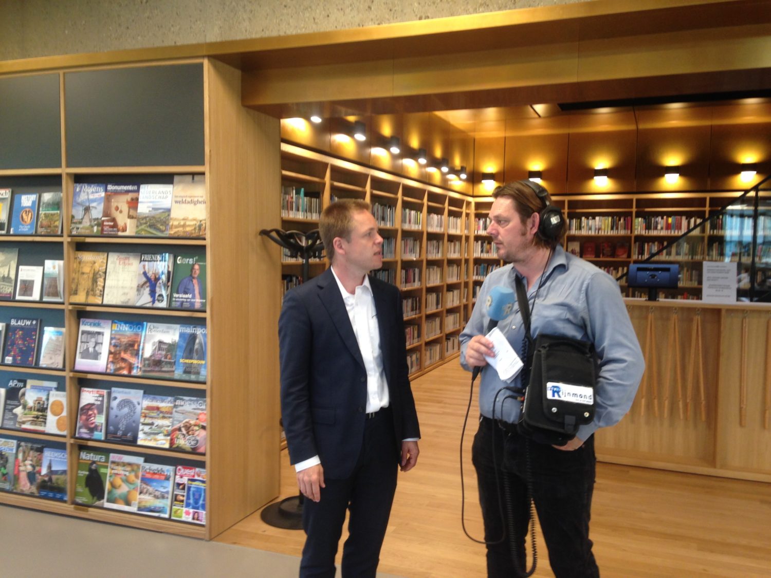 It seems I have some journalistic competition on hand as a reporter from local broadcast station RTV-Rijnmond has arrived. Here he is doing a live radio interview with library director Matthijs van Otegem. Let’s hope his interviewing skills are on par with mine.