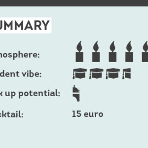 A man in a lab coat opens the door. It’s dark inside. Candles and a ‘medical whiff’ give the room atmosphere. The man – bartender Alberto – points to the house rules. No phones, no photos – except for 1.50 euros using the bar’s polaroid – and no smooching.