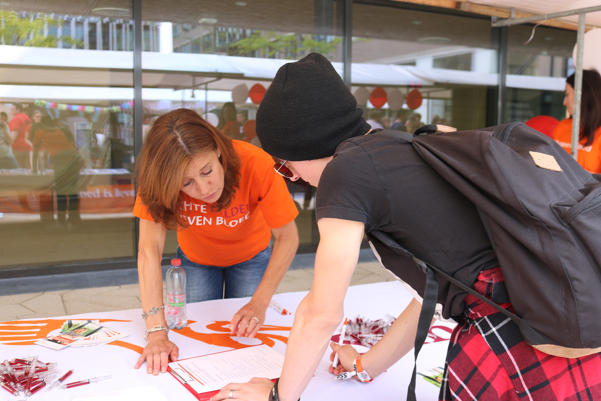 Opposite the EDS stall, Sanquin is looking for blood donors. The stall is looking rather quiet, but the ladies have had a good day. “We’ve collected around fifty names,” says Sandra Tondeur. “That’s not bad at all.” In order to attract donors, Sanquin gives away pens resembling blood collection needles. “And the weather helps,” according to Tondeur. “Otherwise, we’d have been indoors, and this is much more fun. We’ll definitely be back next year!”