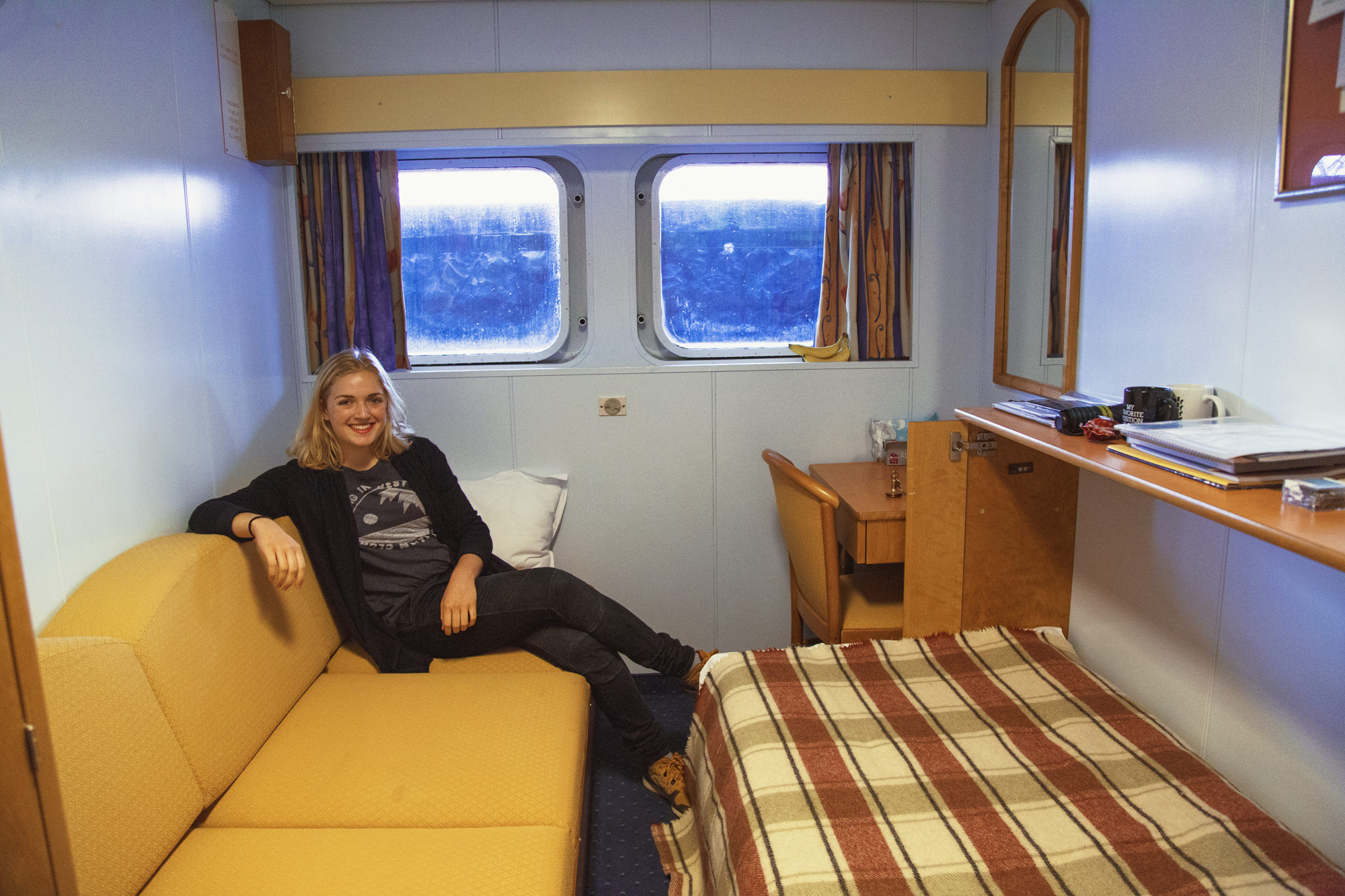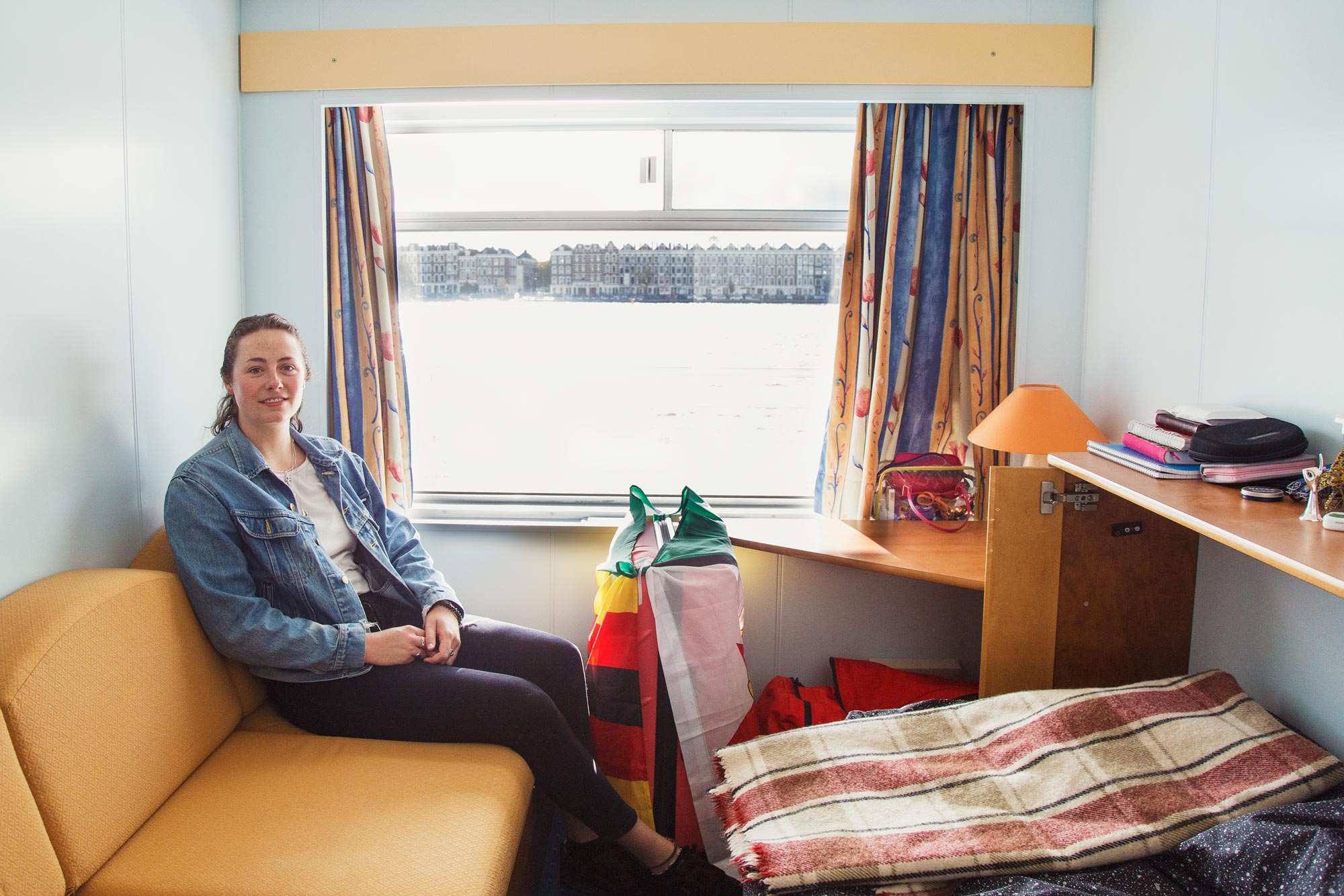 When Holly King (19, Zimbabwe) pulls the curtains open, fellow student Daphne Cornelisse (20, the Netherlands) has to swallow a few times. Holly’s windows don’t just let in sunshine; her cabin also has a splendid view of Noordereiland. In Daphne’s cabin, on the lowest deck of the ship, you don’t look out over the water and Erasmus Bridge. You get a section of quay wall. And Daphne only has direct sunlight during tide: the rest of the time the rays are blocked by the nearby quay. “But I’m not complaining, because living on the boat is quite nice. We have a lot of fun, and at least you have a room of your own with a shower and a toilet. Except you know what you’re missing out on, which is a bit of a shame.”