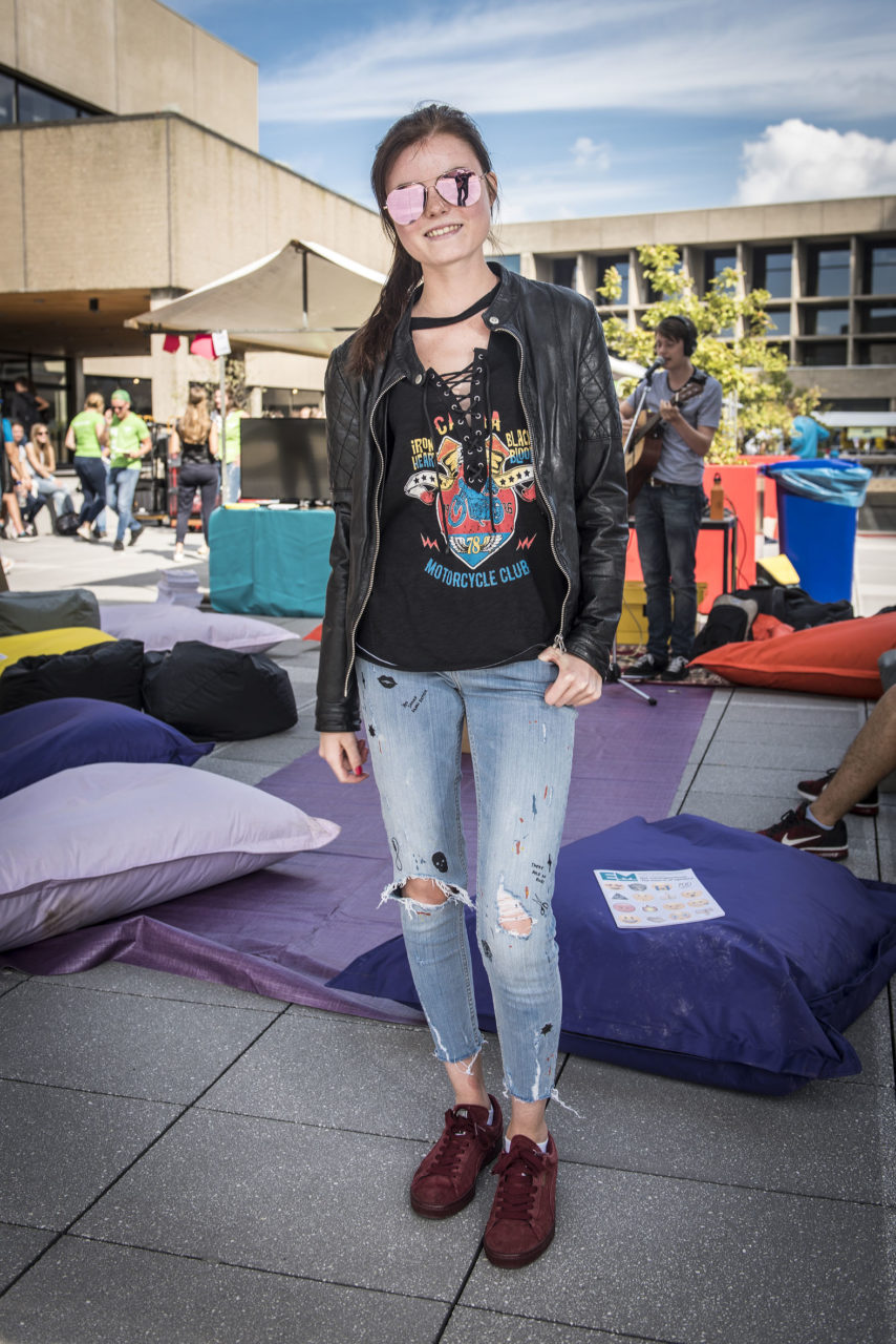 “I put on these trousers because they go with my shirt, which I’ve just bought. Sometimes I dress girly, and sometimes I’ll be more laddish, like now. I don’t really care what’s on the shirt, as long as it matches the rest. I mainly get my inspiration from Instagram and from videos that I see. I’m wearing these sunglasses because they just happened to be in my bag when the sun came out.”