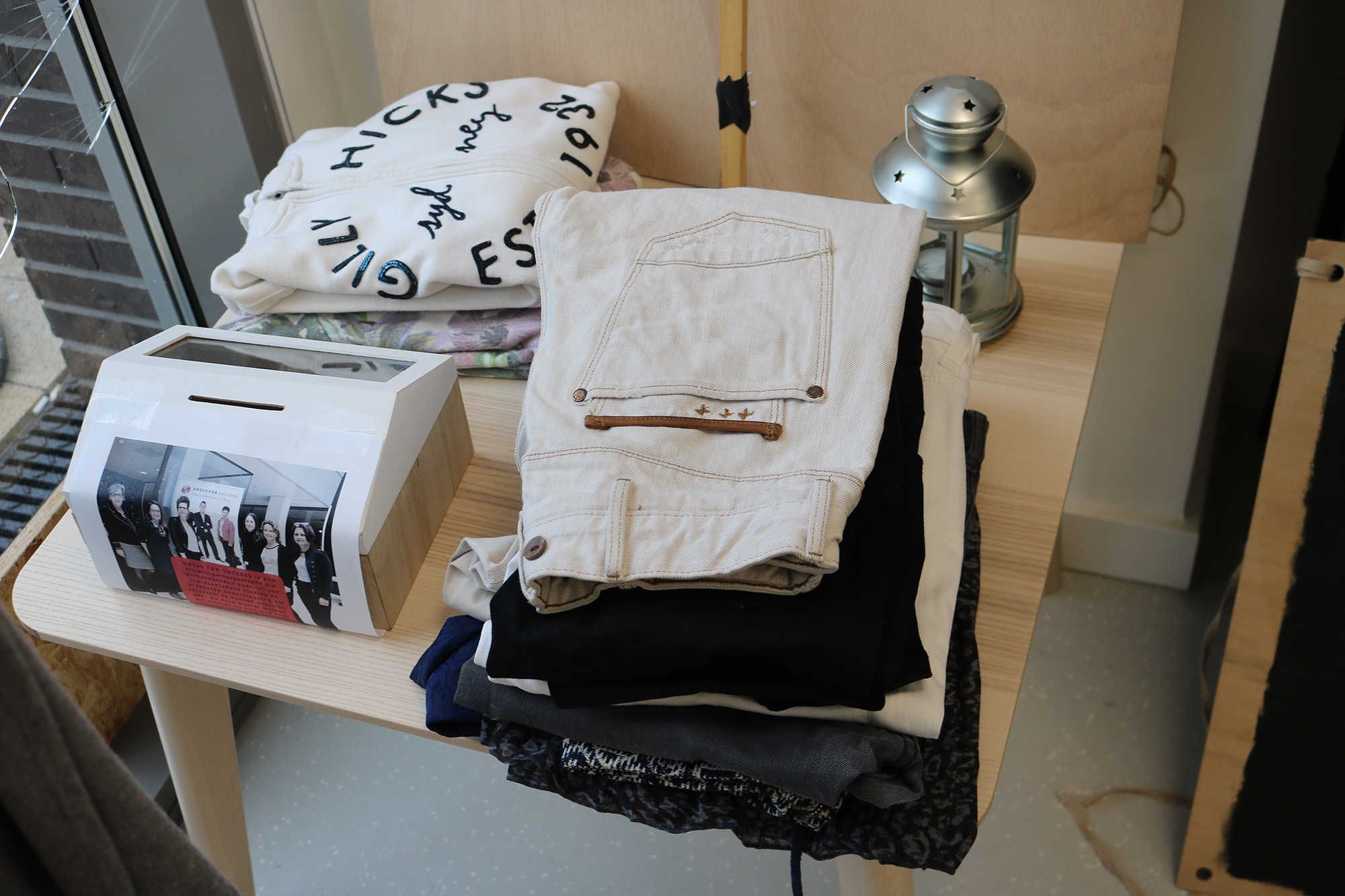 The proceeds from Thrift Hub go to Dress For Success. This is a charity that helps poor, unemployed people find a nice suit that will boost their chances in a job interview. “This charity uses donated, so second-hand outfits,” says Juliette. “That’s why it fits into our bigger picture of sustainability and metaphorically closes the ‘sustainability circle’.”