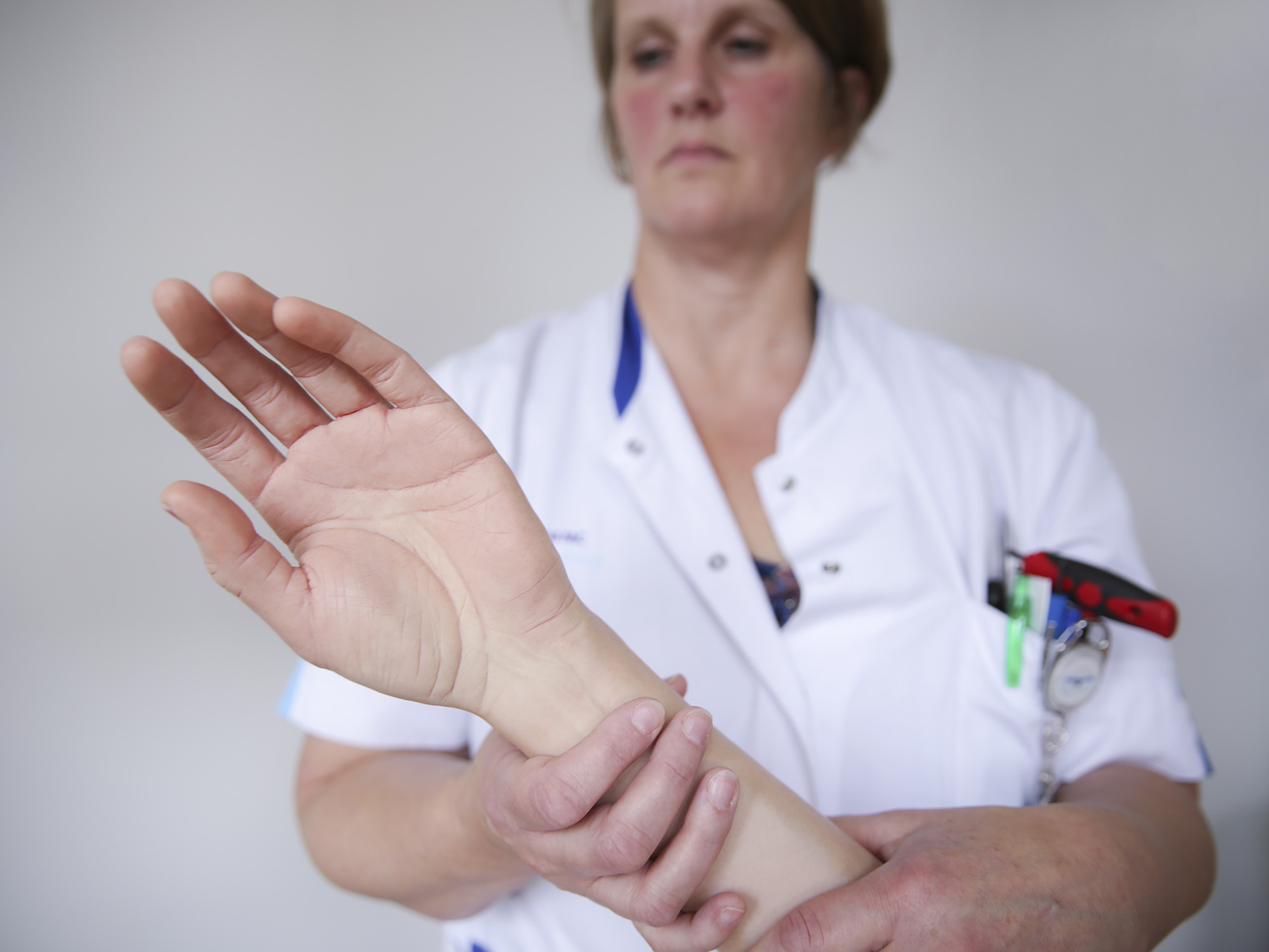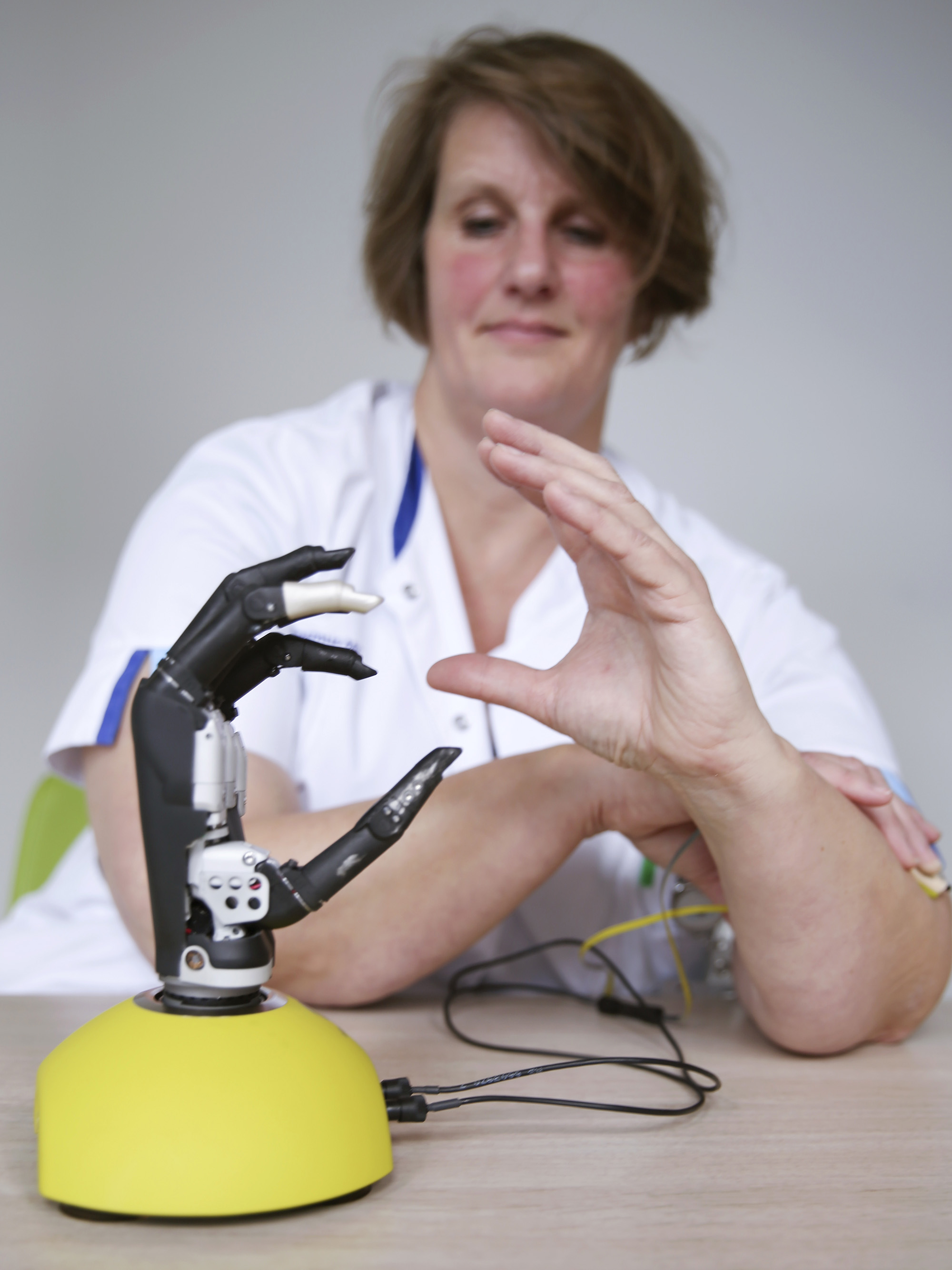 “All fingers can move, and on top of that, each finger has two bending points – two phalanges, if you will,” says Vera van Heijningen, an occupational therapist specialising in hand therapy and a colleague of Selles’ at Erasmus MC. “Which really is unique, because so far, all other myoelectric prosthetic arms (conventional myoelectric prostheses) have only had one point at which they could move, without any phalanges.”