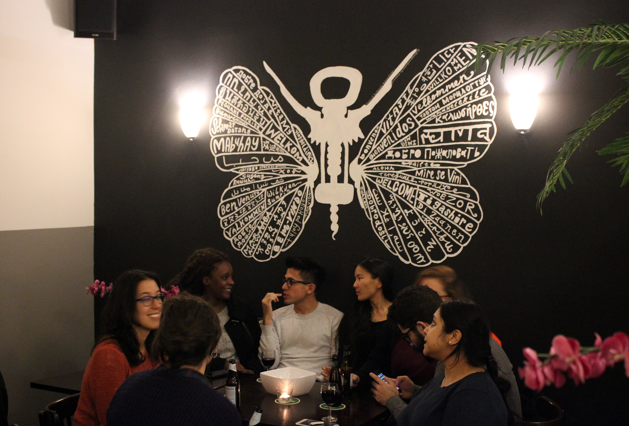 And that was necessary. Old pictures on the wall testify to what was once a rather dusty old fashioned bar. Since the renovation, the Butterfly Bar also has a butterfly. A white butterfly was painted on the black wall opposite the bar. Its wings bear the word ‘welcome’ in fifty languages. The name is derived from a long lost past. Between 1977 and 1993, the ISS was located in Hotel De Wittebrug. “There was a hotel lobby with red plush banks and a big silk butterfly hanging on the ceiling,” says Sandy. “Now the interior has something to do with the name again.”