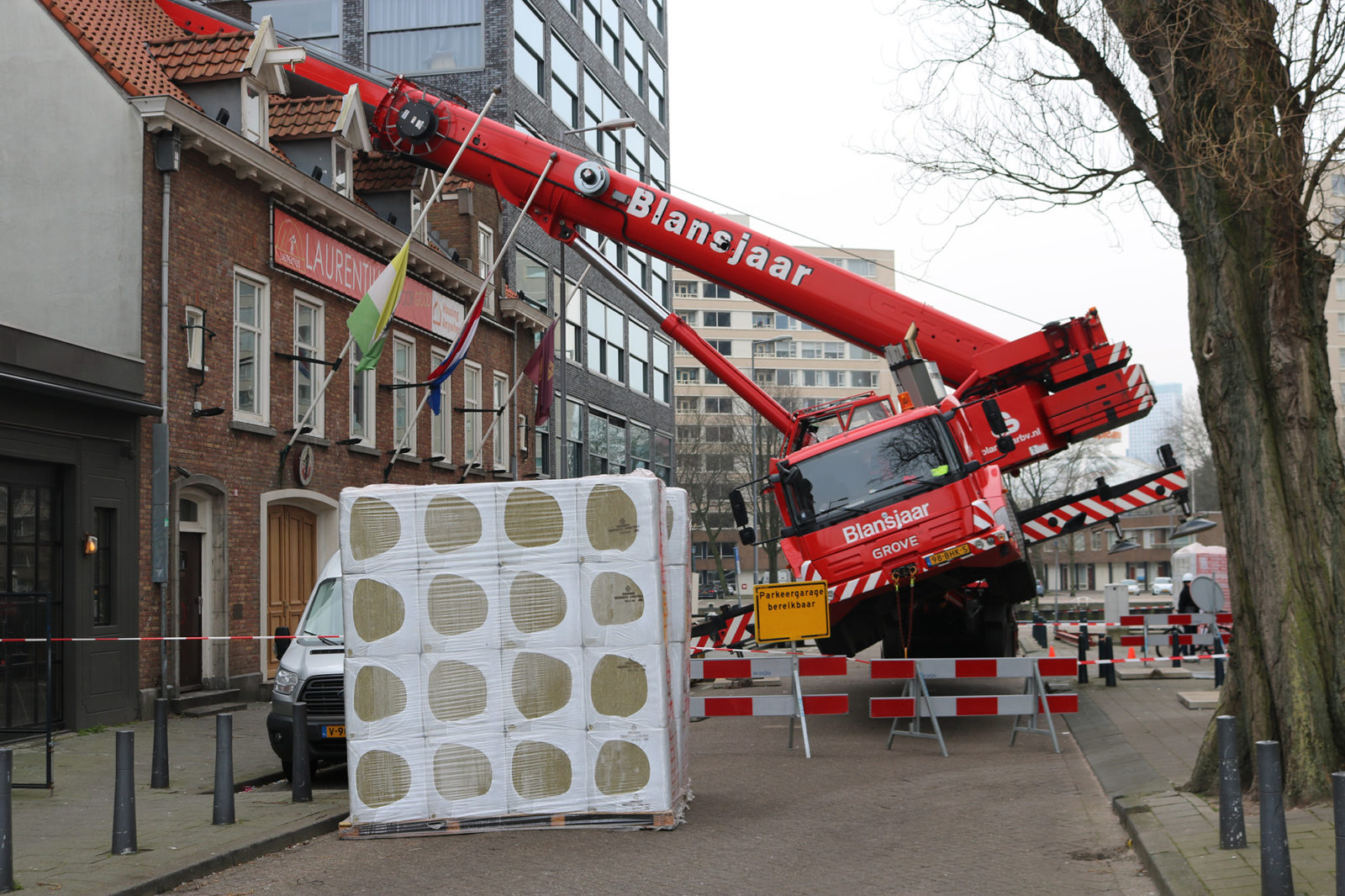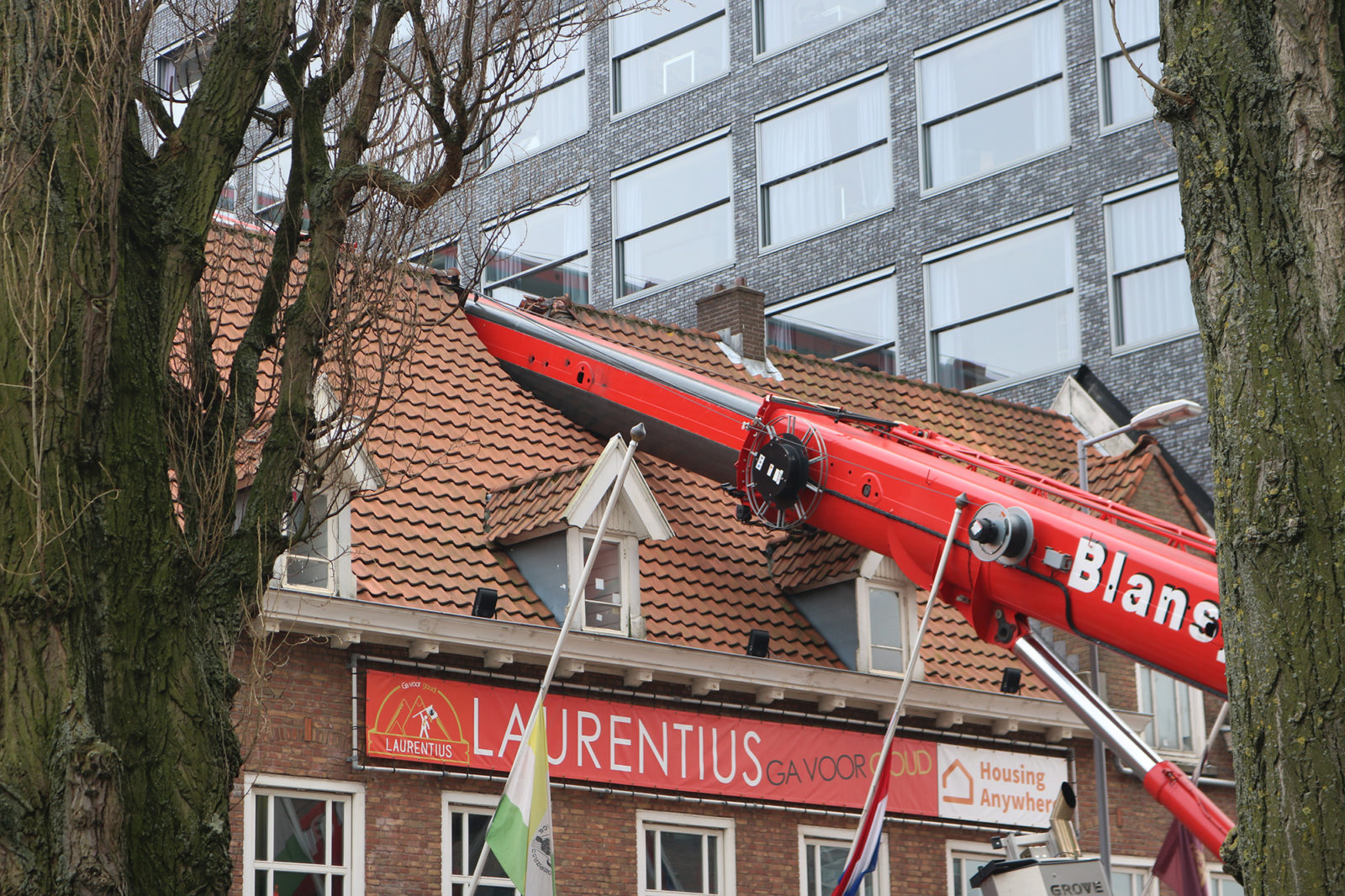 At Infirmeriestraat, two Laurentius members were peering somewhat despondently at the crane balanced on their building’s roof. The Board of Laurentius hadn’t arrived on the scene yet: according to the members, they were attending the funeral of Laurentius’s honorary member and former Dutch prime minister Ruud Lubbers, which was being held elsewhere in Rotterdam at the same time.