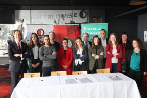 “It’s nice to sign a contract that is not worth a fortune for a change.” Despite the fact that he hasn’t been at Feyenoord long, general manager (and EUR alumnus) Jan de Jong has already signed contracts that involved far greater amounts of money. However, that does not mean he is not happy with the pieces of paper that are currently awaiting his signature. “This is a major acquisition,” he says jokingly while shaking the hands of ESSB Dean Victor Bekkers and assistant professor Brian Godor. While posing for a photo with the first crop of students to join his club, he adds: “Even in these early stages, this is a better team than the one we’ve got.”