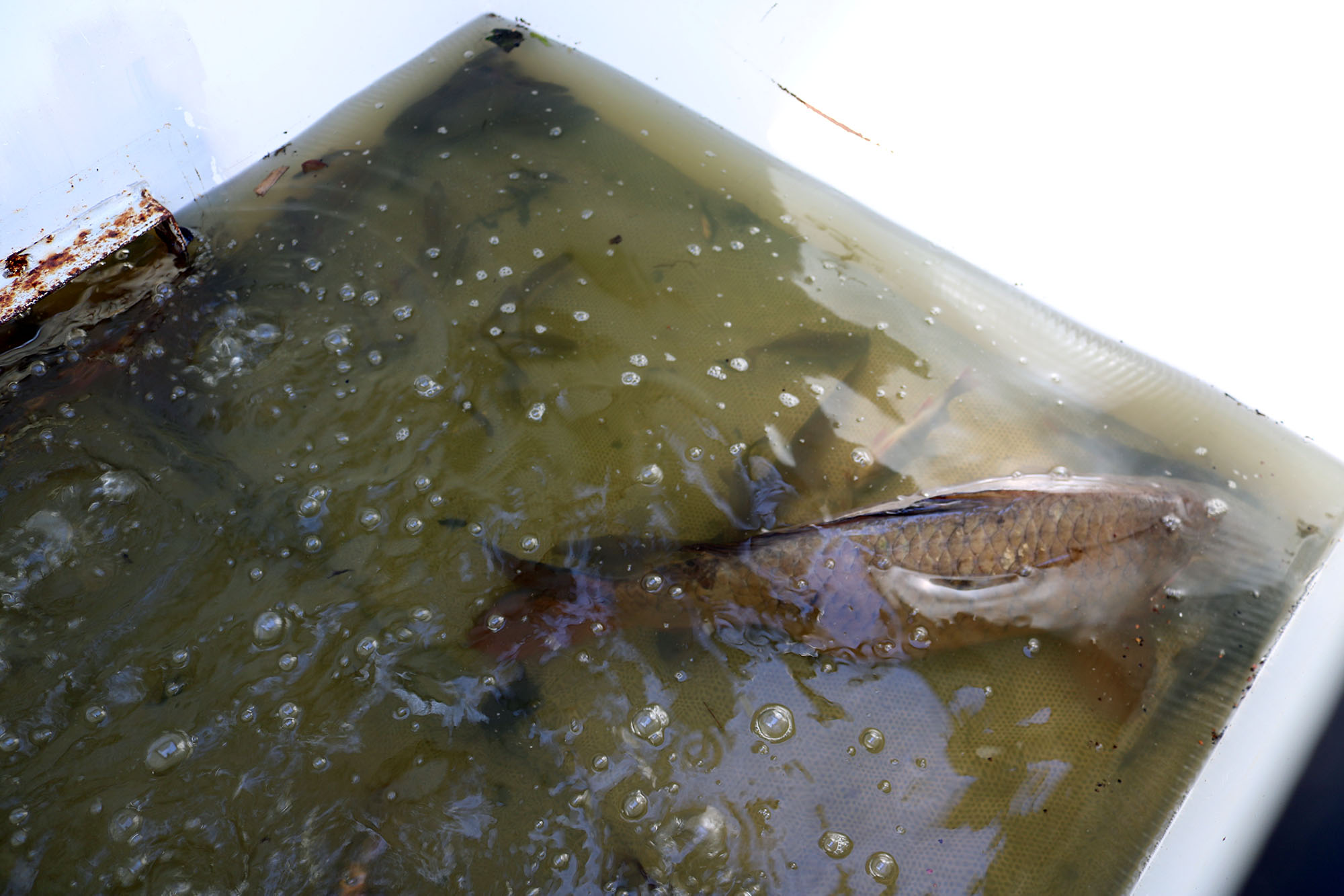 It doesn’t really hurt the fish, Henk assures us. “You could compare it to a local anaesthetic at the dentist’s.” The captured fish recover in two white bubble baths waiting nearby on a nearby trailer. These basins will also be used to transport the animals to their new home. “Perch tend to need a bit more time to fully recover from the stun pulse.”