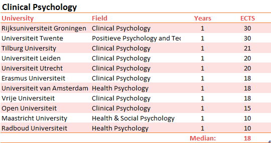 Ten or thirty credits? Other degree programmes, too, vary significantly in how many credits they award to master theses. To give you a few more examples, we have included another two degrees in a table: communication sciences and clinical psychology.