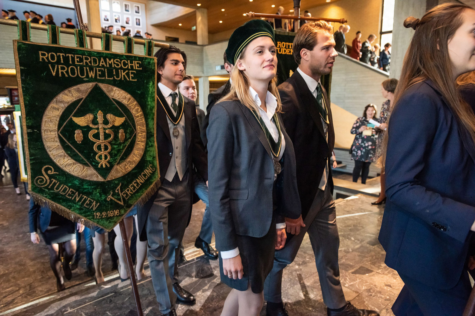 The procession of professors was modest and largely consisted of external invitees, emeritus professors and the university’s directors. Thankfully, there were obviously some representatives of student societies, too, who brought down the average age of the attendees. However, there were few representatives of study societies, although Rotterdam has considerably more of those than it does fun-oriented student societies.