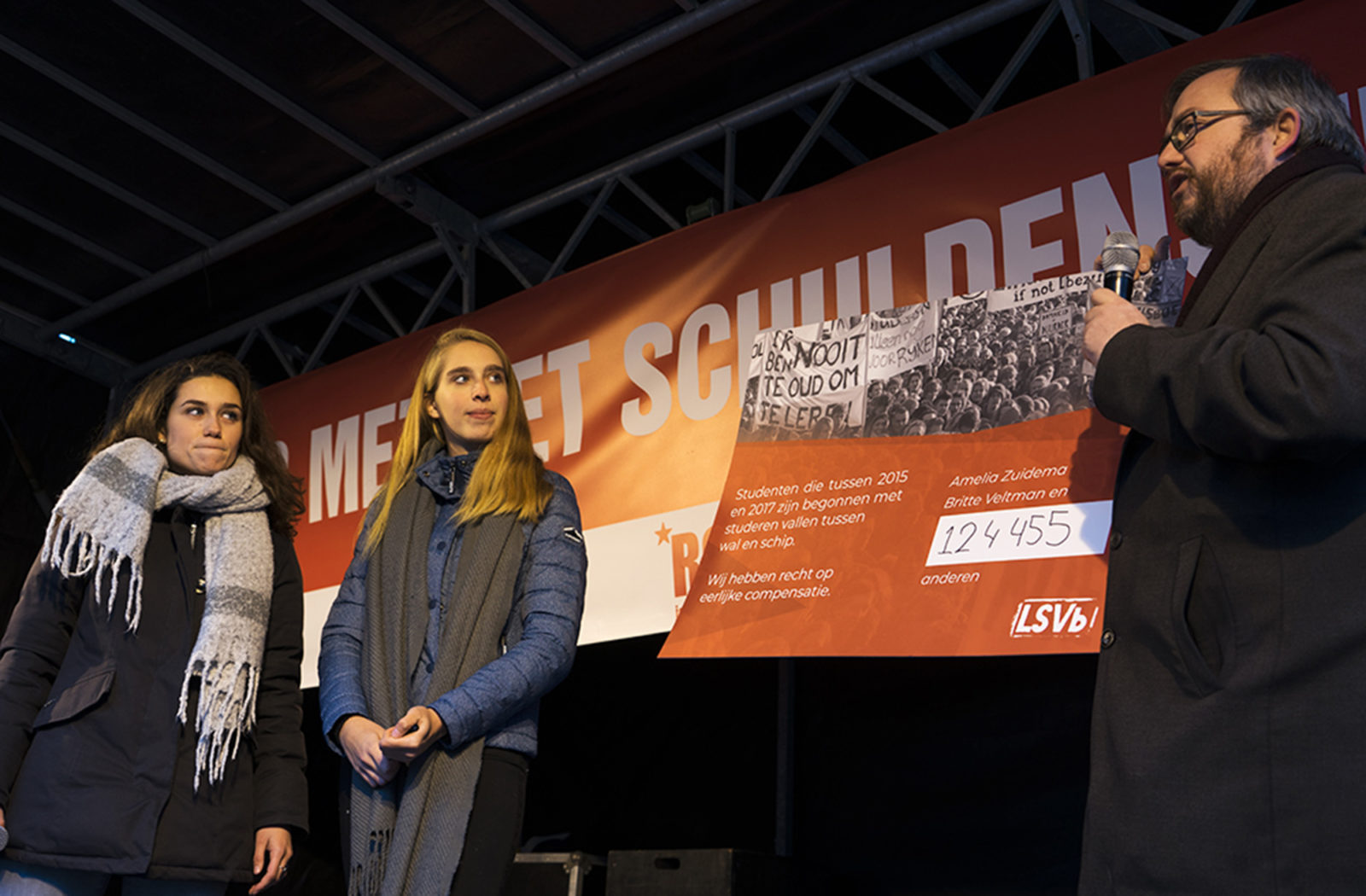 Britte Veltman and Amelia Zuidema presented the petition to Member of Parliament Frank Futselaar during student demonstrations this past Saturday.