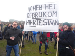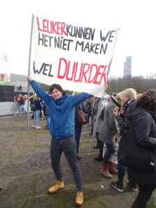 The rolled-up banners and folded-up placards that were tucked away on the jam-packed trains during the journey to The Hague were produced with great enthusiasm once the protesters got to the Malieveld field. ‘Striking is silver, teaching is golden’, read one of them.