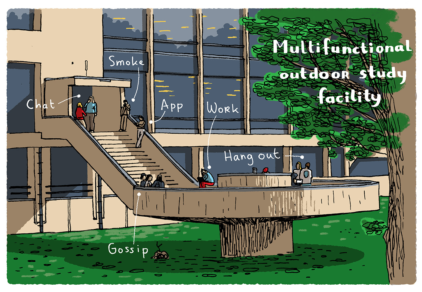 The collective ikRotterdam consists of the artists Evalien Lang, Ferry van Steijn and Mark Kolle. Every month, they comment on something remarkable on campus in a cartoon.