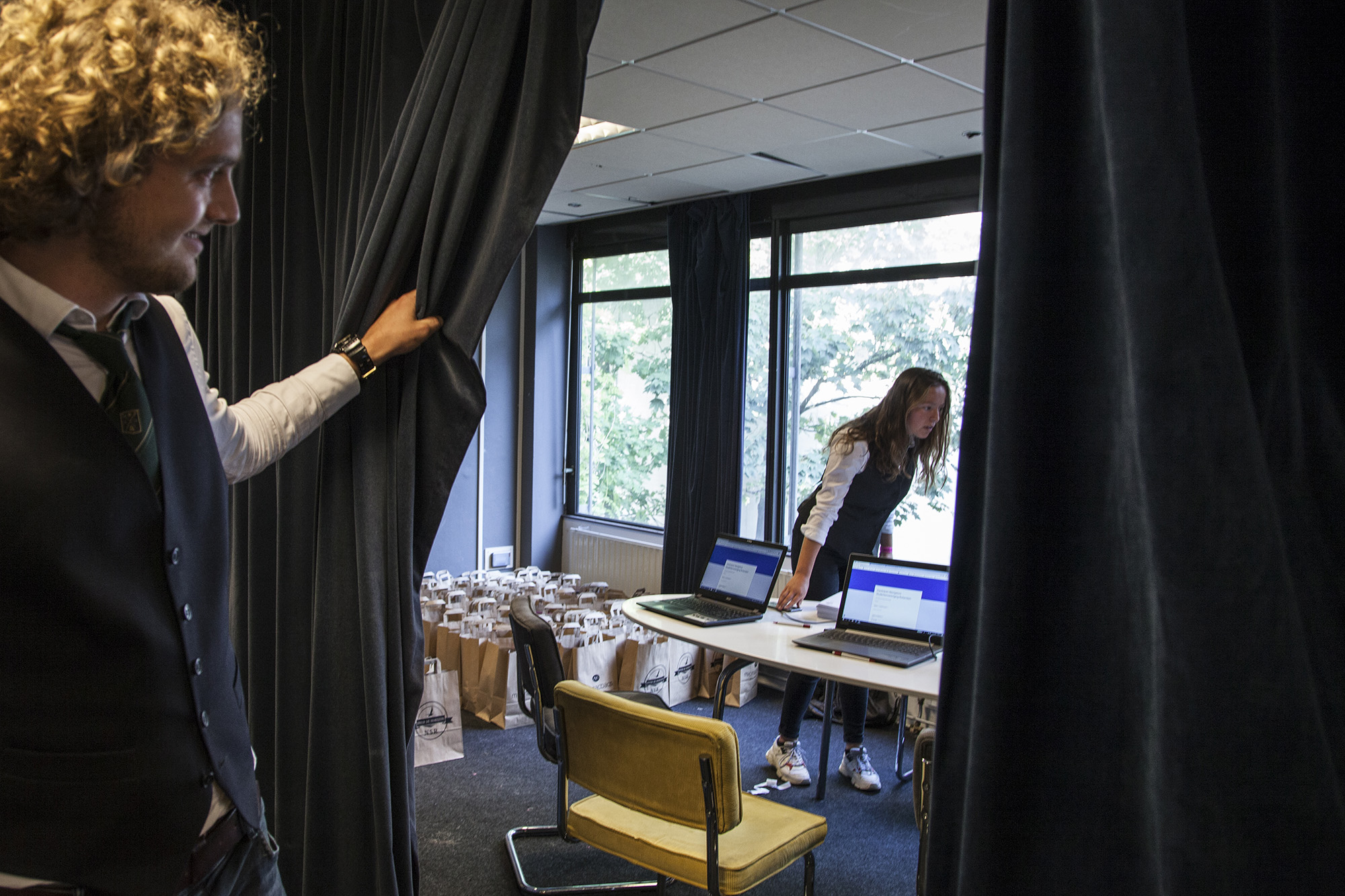 At the back, there’s a kiosk where first-years can enrol. Anyone over the age of 17 who agrees with the association’s Christian principles can become a member. Outside, there’s a group of students speaking English. One comes from India, another from Germany, someone else from Austria. “We don’t know if we can join, because we don’t speak Dutch.” Noordhuis: “We don’t actually have an English-language fraternity or anything in our association, but international students can join a non-student part of the umbrella organisation: ‘Netwerk’.”