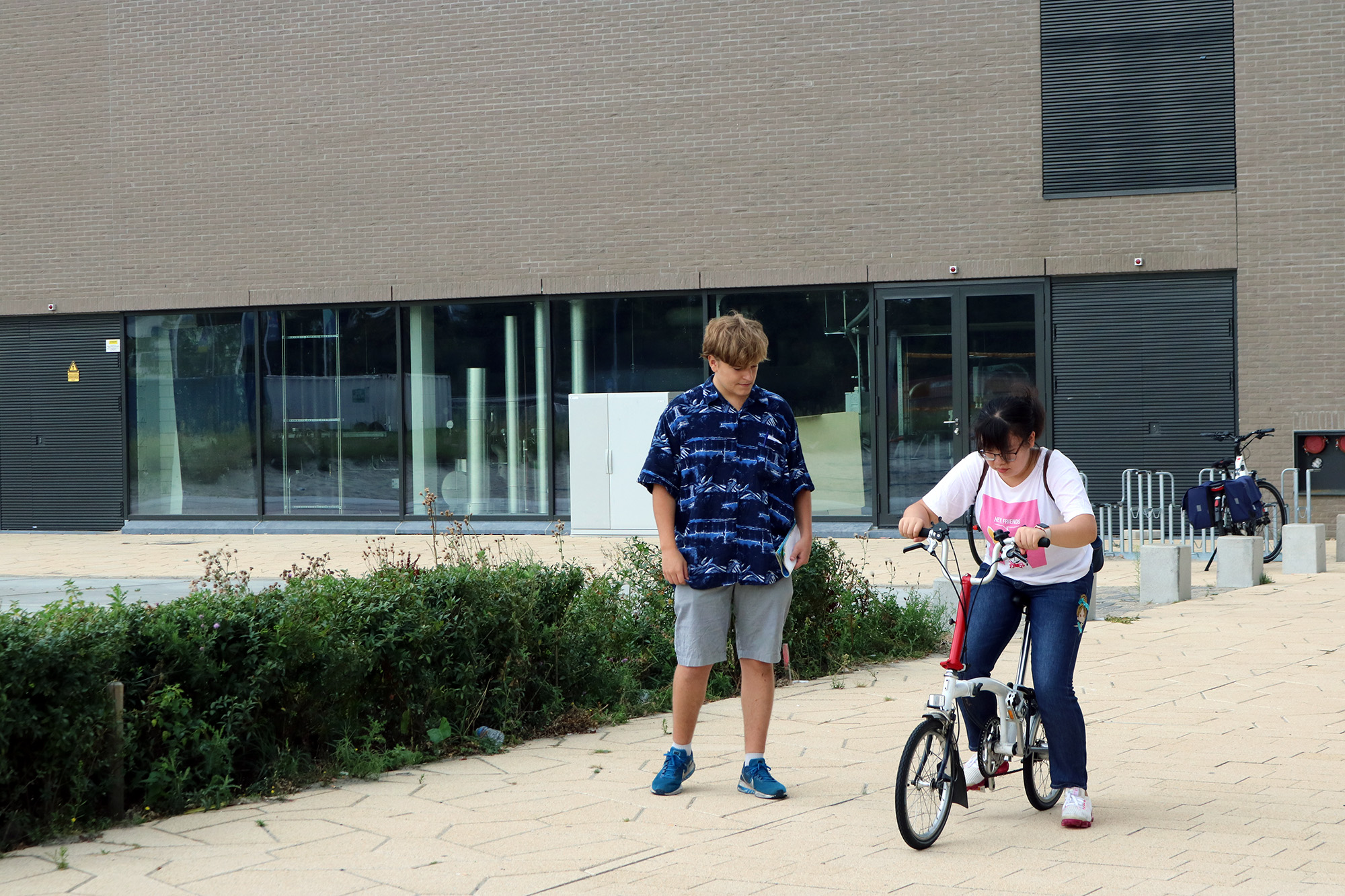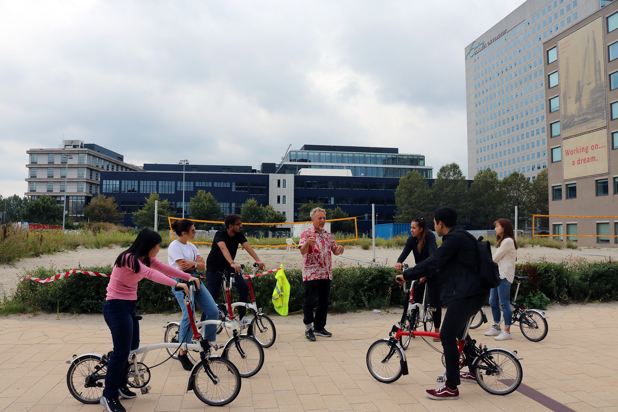 The cycling lessons organised by Erasmus University had been fully booked but perhaps due to the pressing dark clouds gathering above the Woudestein campus, only seven of the ten students showed up for the 11 am lesson. Despite the disappointing turn-up, the students seemed to be in good mood as they chatted outside the bike shop in the Polak building, waiting for the lesson to start and sharing their own experiences with biking.