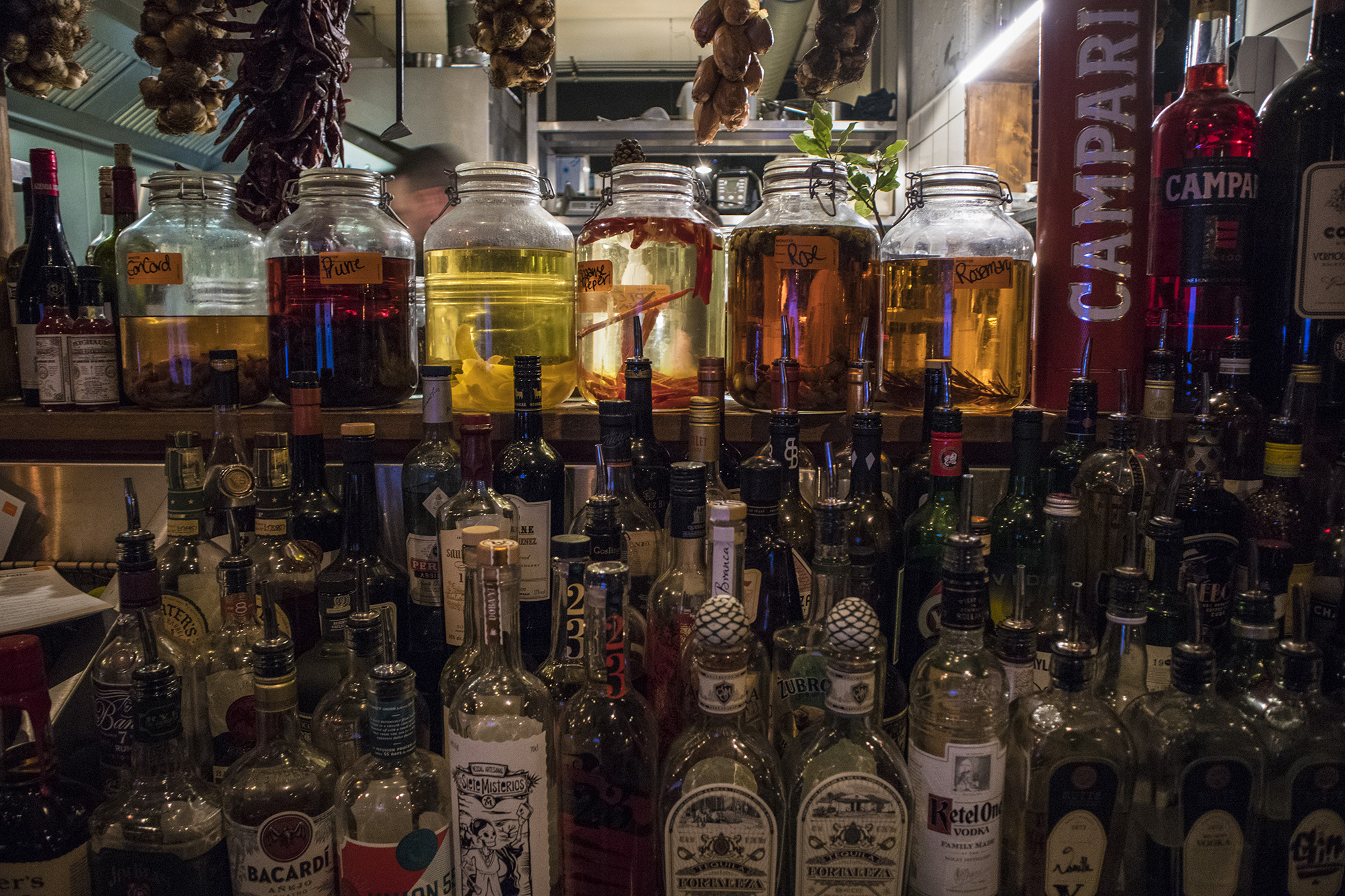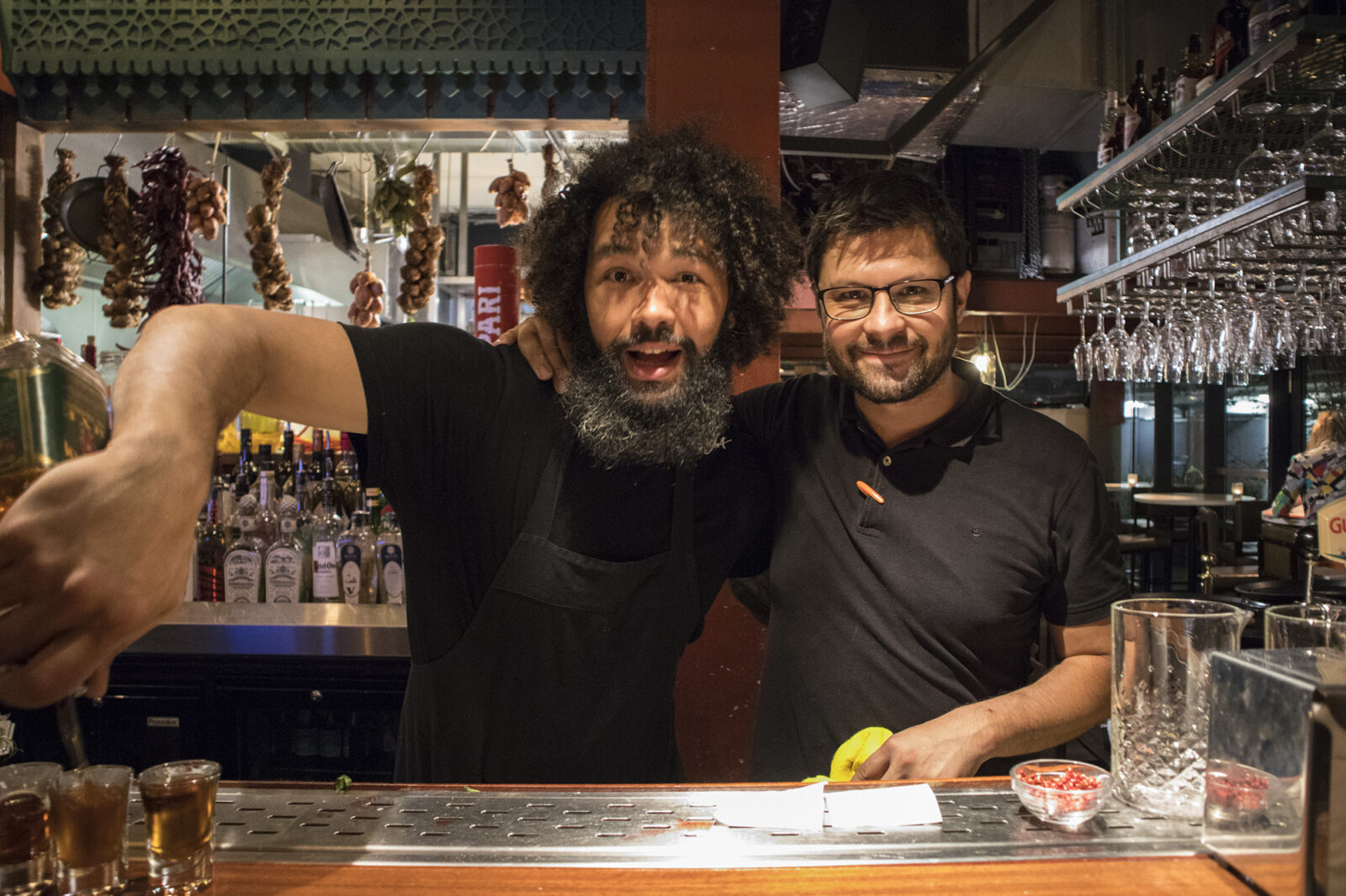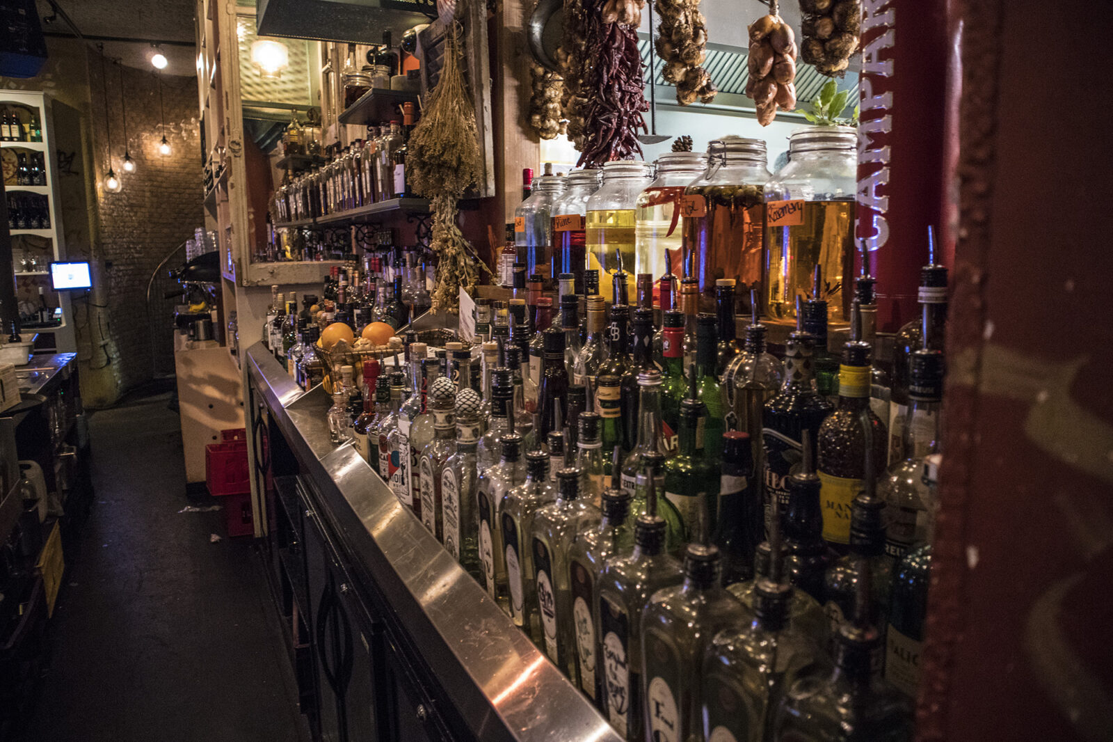 Back in the old days this was a snack bar where punters could enjoy a kapsalon (chips with shawarma, melted cheese, iceberg lettuce) with strange dudes until the wee hours of the morning. Not that you can tell that from the interior, or smell it, for that matter. The place has been open for meals and drinks since 2016. When we enter, we are given a warm welcome by our host, John. The place is packed; if we want a table, we’ll have to wait a little while. But we actually wish to sit at the bar, which turns out to be a good decision. We sit down on the colourful bar stools, with large hams and bulbs of garlic hanging above our heads. From here we have a great view of the wide range of drinks, pots and pitchers behind the bar. The various types of home made brewage aren’t just for decorative purposes: they are actually used in the cocktails. In order to quench our thirst, we start off by ordering some beers, and they taste exactly as they should.