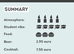 Drinks are easily affordable for students. A kopstootje (beer with a glass of jenever) costs just €4.50. A sound basis for a hangover. They also have a few classic cocktails on the menu (such as Long Island Iced Tea) and the guys are more than happy to make a cocktail for you that’s not on the menu, as long as they’ve got the required drinks to hand.