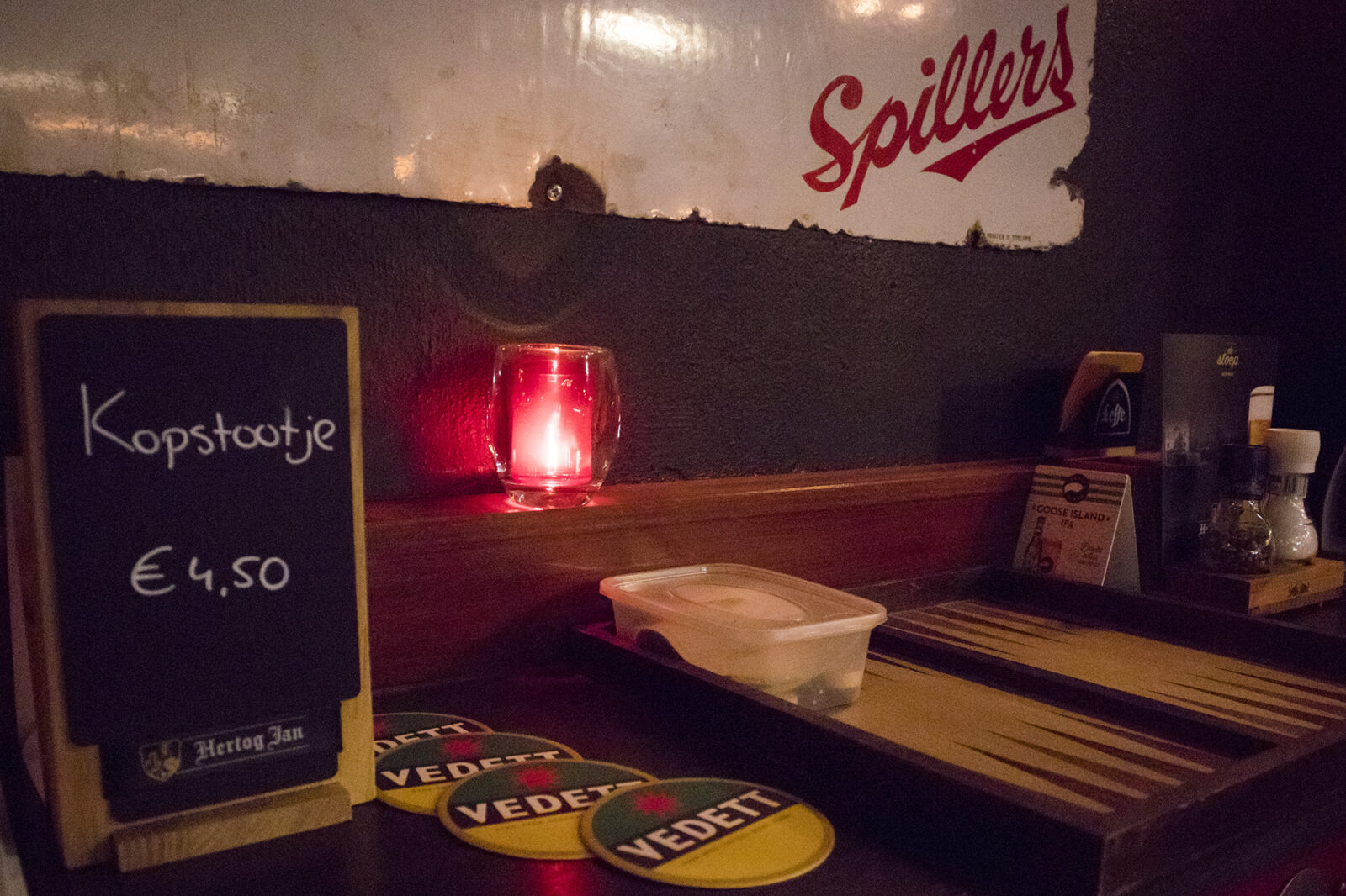 Jesse, the new owner of De Stoep, made us a welcome drink. A shot of Jack Daniels and something sour; should be delicious. The café décor is simple: just a few small plants and candles. But they don’t need anything else, as this pub exudes atmosphere. Leather sofas and chairs, stained glass windows and a copper bar give De Stoep the appearance of real bruin café, a traditional Dutch pub.