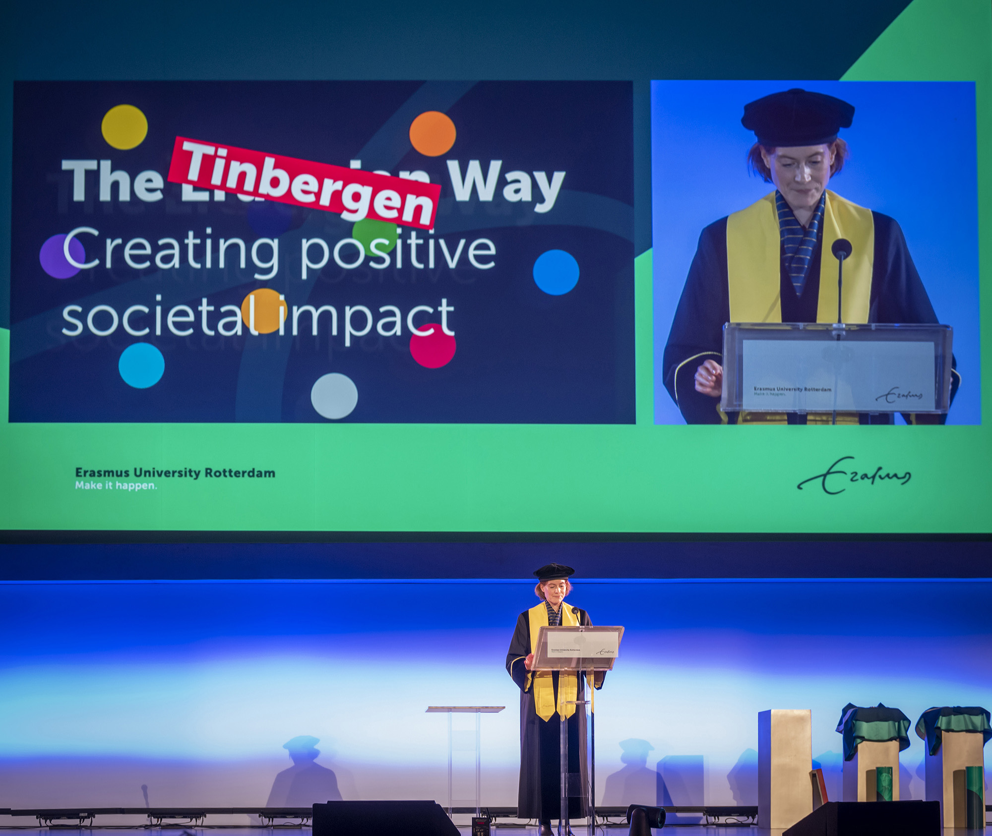 Former ESE dean Philip Hans Franses nominated Duflo long before it was announced that she was going to be awarded a Nobel Prize. According to Olivier Marie, she was nominated ‘because her research actually saves lives’. Prof. Duflo’s research focuses on the economic lives of the poorest socioeconomic class, with a special focus on drawing up and evaluating policy. Marie said that Duflo has made a great contribution to the science of economics in that she uses randomised controlled trials, a method borrowed from medical science. In her speech Duflo touched at length on Tinbergen’s legacy in her field of research.