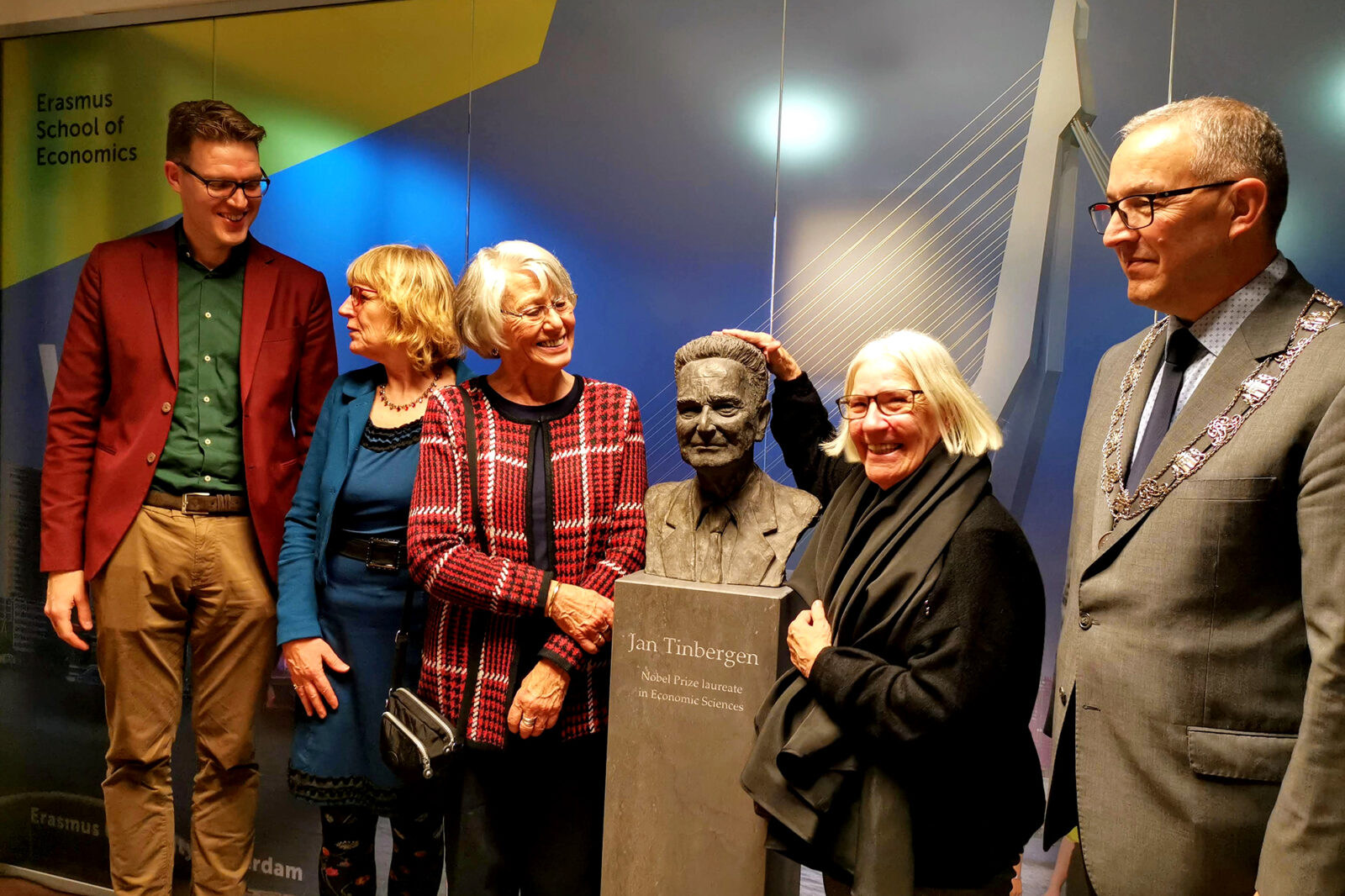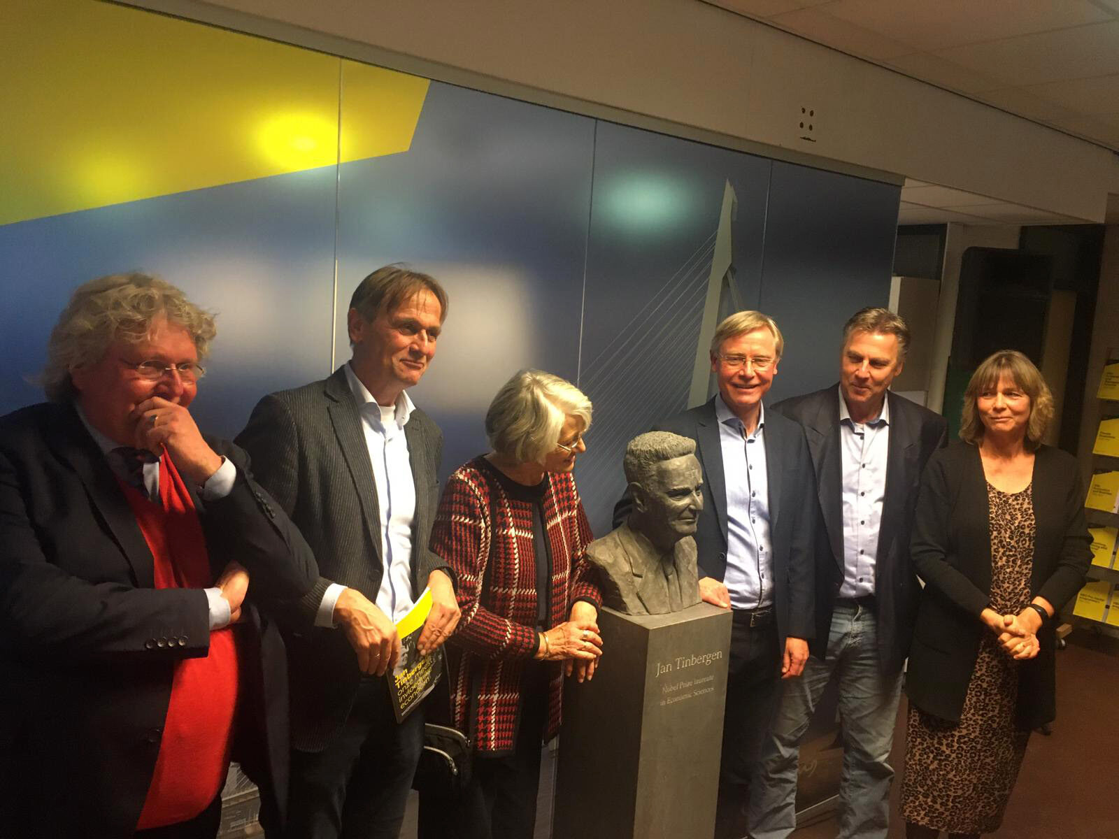Jan Tinbergen’s daughters are left (Els) and right (Hanneke) of the bust. Furthermore: Biographer Erwin Dekker, artist Lia Krol and mayor Ahmed Aboutaleb.