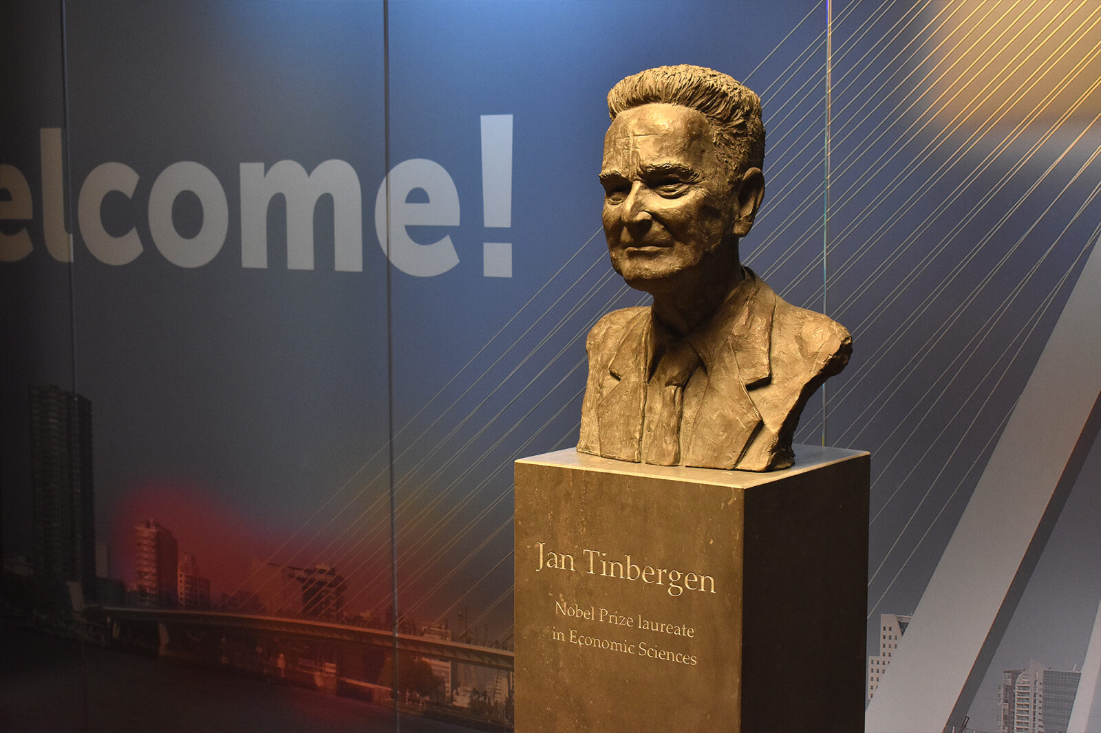 Jan Tinbergen’s bust is located in the entrance hall of the E-Building on the Woudestein campus.