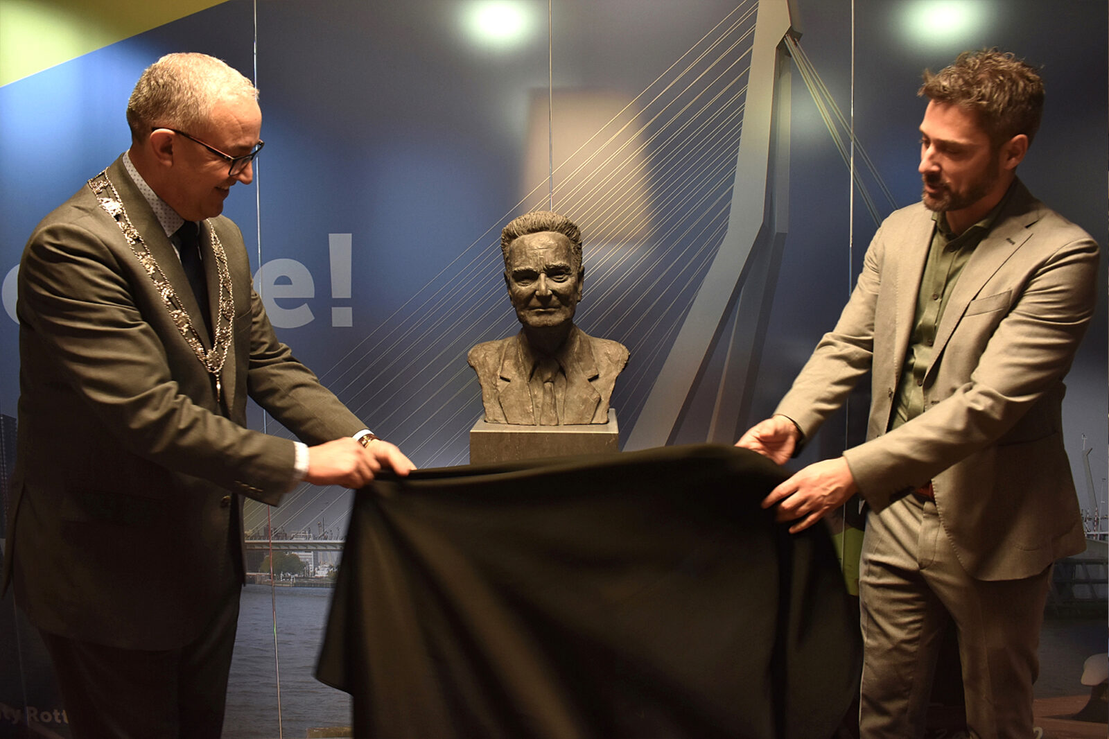 Jan Tinbergen’s (1903-1994) daughters were in complete agreement. The bust of their father that was just unveiled is a very good likeness of their father. “We were allowed to come to the artist’s workplace and provide some feedback. The bust had a bit of a hawk nose for a bit, but the artist immediately fixed that.” The sculpture was unveiled on Tuesday by Rotterdam mayor Ahmed Aboutaleb.