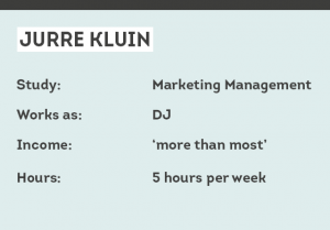 Being a DJ entails irregular working hours. Usually Jurre performs two or three times a month. “I usually spend about five hours on a performance,” he says. He doesn’t want to mention how much money he makes. “What I can say is that it pays better than most side jobs.”