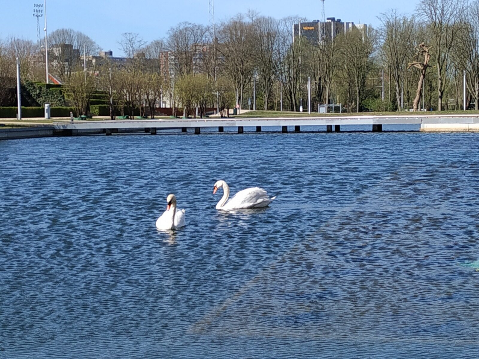 For her part, Esther spent some time on the water’s edge looking at the two animals as well. “I was there for at least fifteen minutes, to see how they swam around each other and greeted each other. It was like, hey, there you are, nice to see you again. There was nothing hysterical about it, none of that ‘kiss, kiss, cuddle, cuddle’ stuff. Just ‘all right, we’re whole again now’. It was a fairy tale of sorts on an empty campus. That should keep me going for a while.”