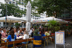 We had nearly given up on finding any significant number of students when, at 10pm, much to our surprise, we suddenly ran into some seventy business administration students at Biergarten, one of Rotterdam’s favourite summer hang-outs in non-coronavirus times. The students were observing the restaurant’s rules to a T, which is to say that they were all at tables seating up to eight persons, and no one else was joining them in that part of the outdoor seating area. However, they were not exactly keeping 1.5 metres’ distance from their table fellows. Biergarten’s manager explained to us that students’ contact details were taken on a group-by-group basis, and that the students were required to stay at their own tables.
