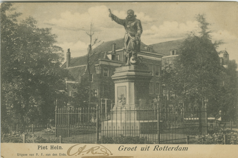 ‘Admiral Pieter Pieterszoon Heyn. The grateful progeny. Unveiled: 17 October 1870’ is stated on the statue of Piet Hein in Delfshaven. During unveiling by King Willem III, the statue was a little more to the west, on Piet Heynsplein, but has been at this location since 1966. Hein was mainly known for conquering the silver fleet, with the money being awarded to the authorities behind the colonial system. A portrait of Hein used to hang in the office of the Rotterdam West India Company.