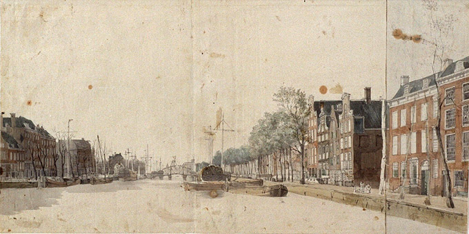 The Leuvehaven is now surrounded by high buildings. Nothing remains from the time that stately merchant houses used to be located along this water. One of these houses is known to be paid for with money earned in the slave trade. That building belonged to the young Josua van Belle. Looking at this image, it must be one of the buildings on the right, with blue roof tiles on the front. Although it is not known exactly which house it is exactly.
