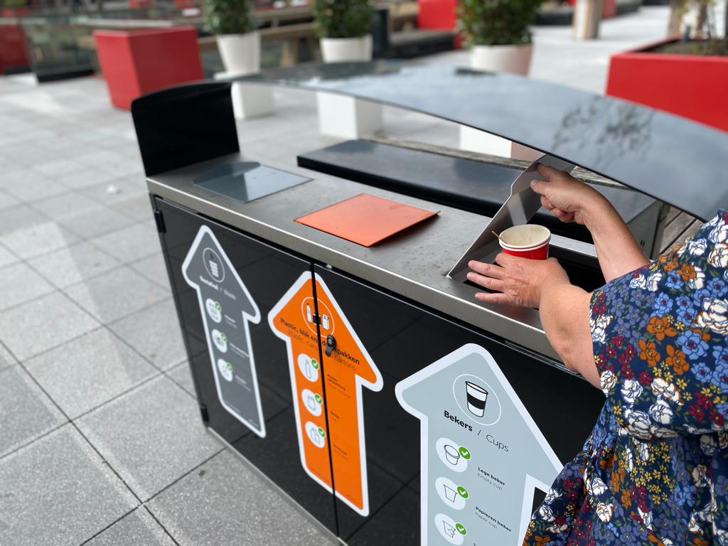 Five waste streams can separated in the buildings in the same way as using the previous temporary cardboard containers: coffee cups, paper, fruit and vegetable waste, residual and plastic, metal and drink cartons (PMC). Outside, there are three waste streams. Fruit and vegetable waste and paper will not be collected there. “Vermin is attracted by fruit and vegetable waste and we’d of course prefer not to have that. And paper collected outside quickly becomes wet and dirty, making it more difficult to recycle.”