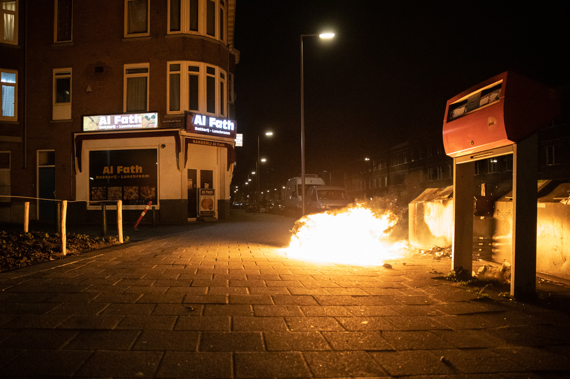 However, there was a great deal of vandalism and looting in Rotterdam Zuid, where the marechaussee (military police corps), in full riot gear, blocked off a street. A burning van can be seen in the background.