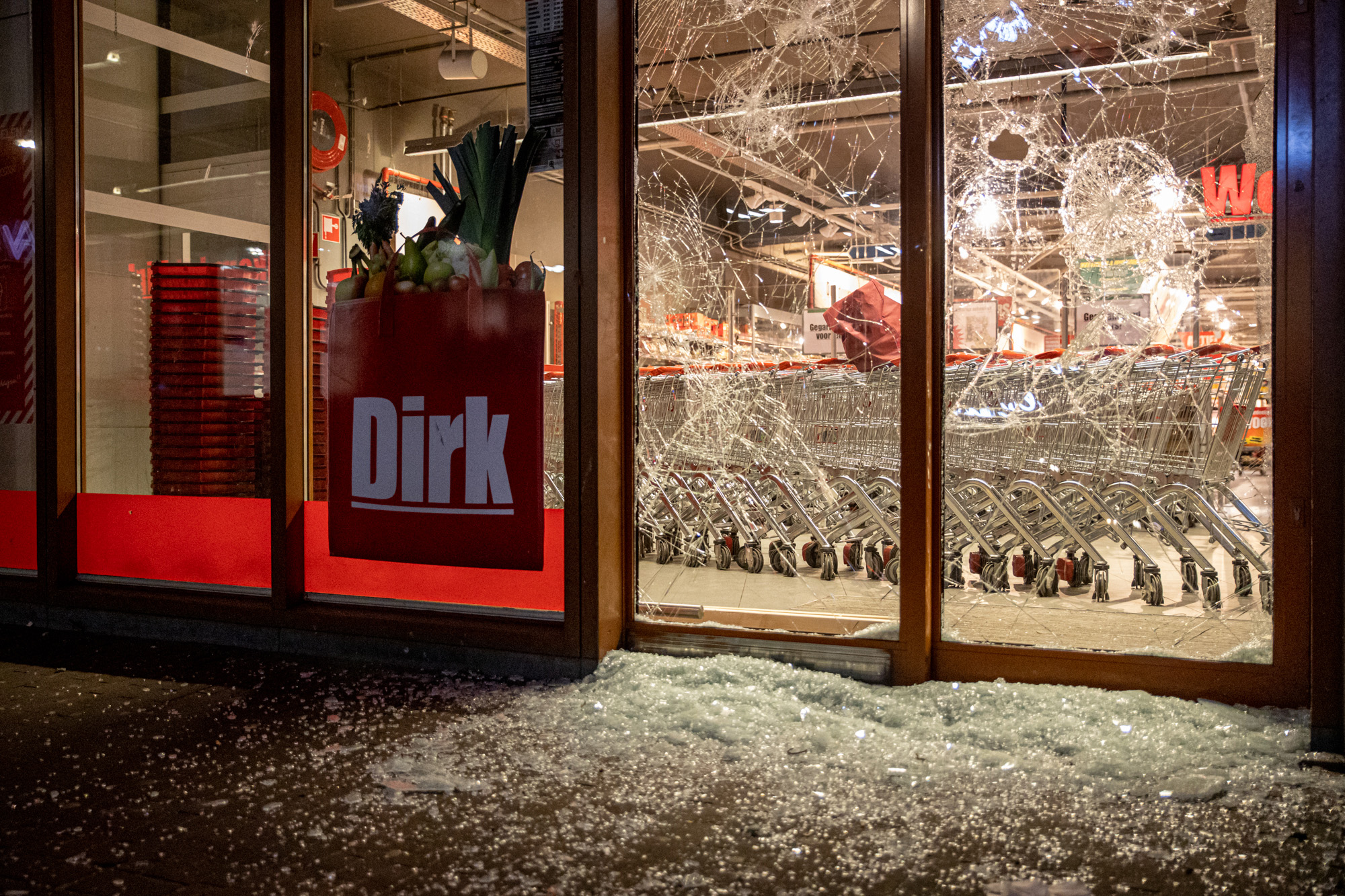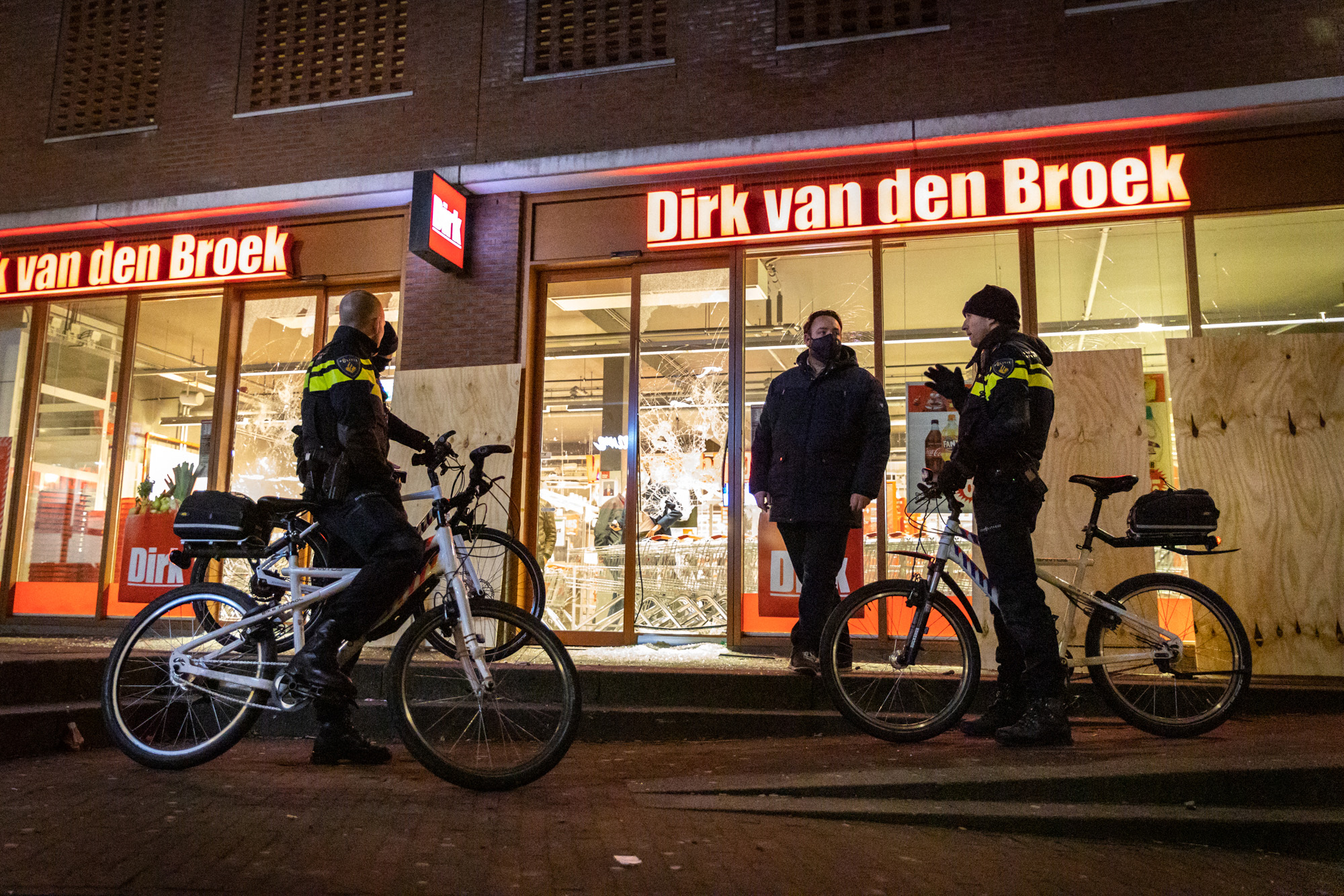Police officers standing in front of the Dirk van den Broek supermarket, which had been looted just before.