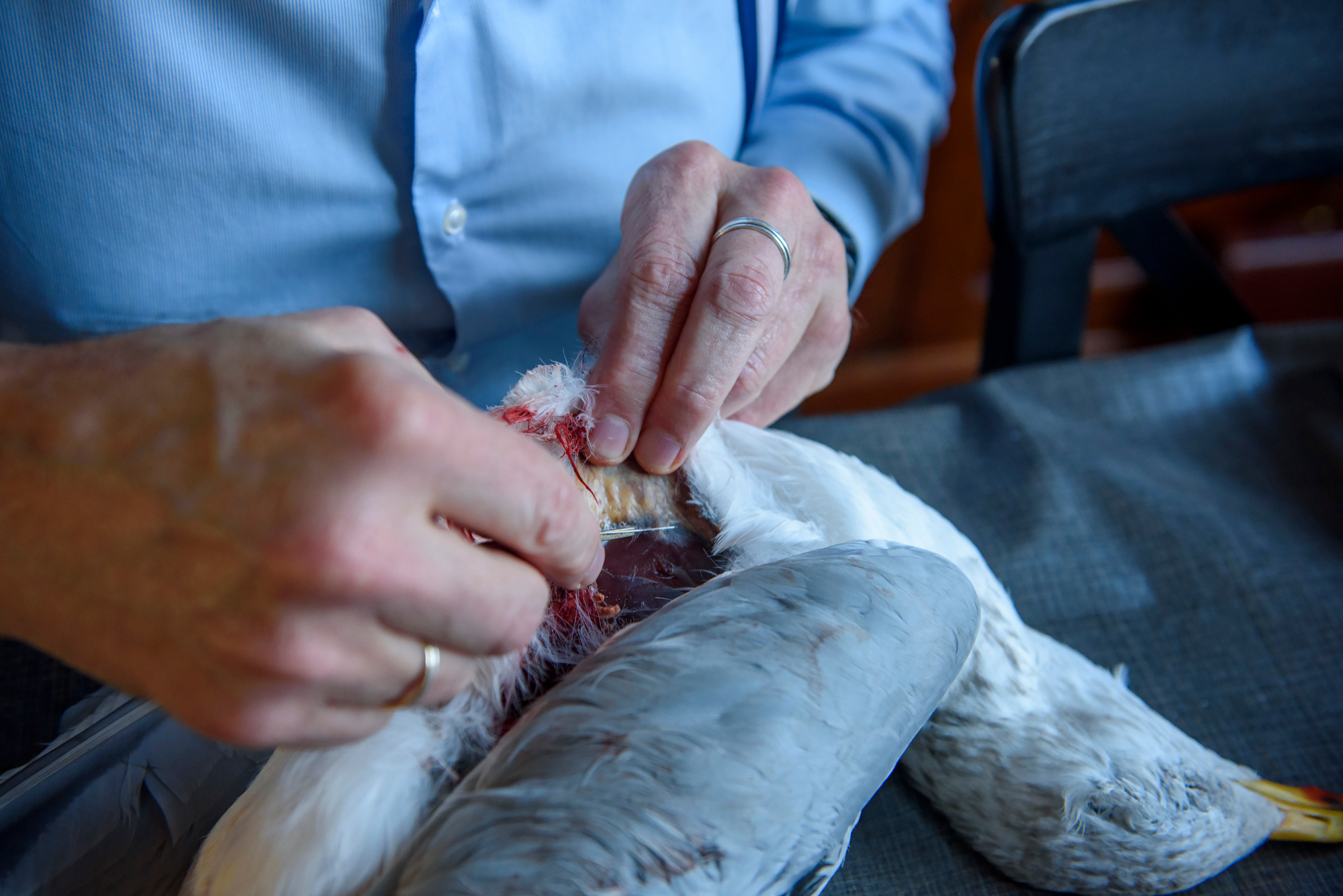 Using his hands and a scalpel, Kompanje separates the herring gull’s skin from its muscles and organs, which he will soon be replacing with wire and kapok: a kind of stuffing. He then measures the bird’s wings, beak, tail and legs. He also records crucial information like where and when the animal was found, as well as the contents of its stomach. You can find the most unusual items in there – from fish to junk food, dumplings to Christmas decorations. “This time round it’s some grass and sand.”