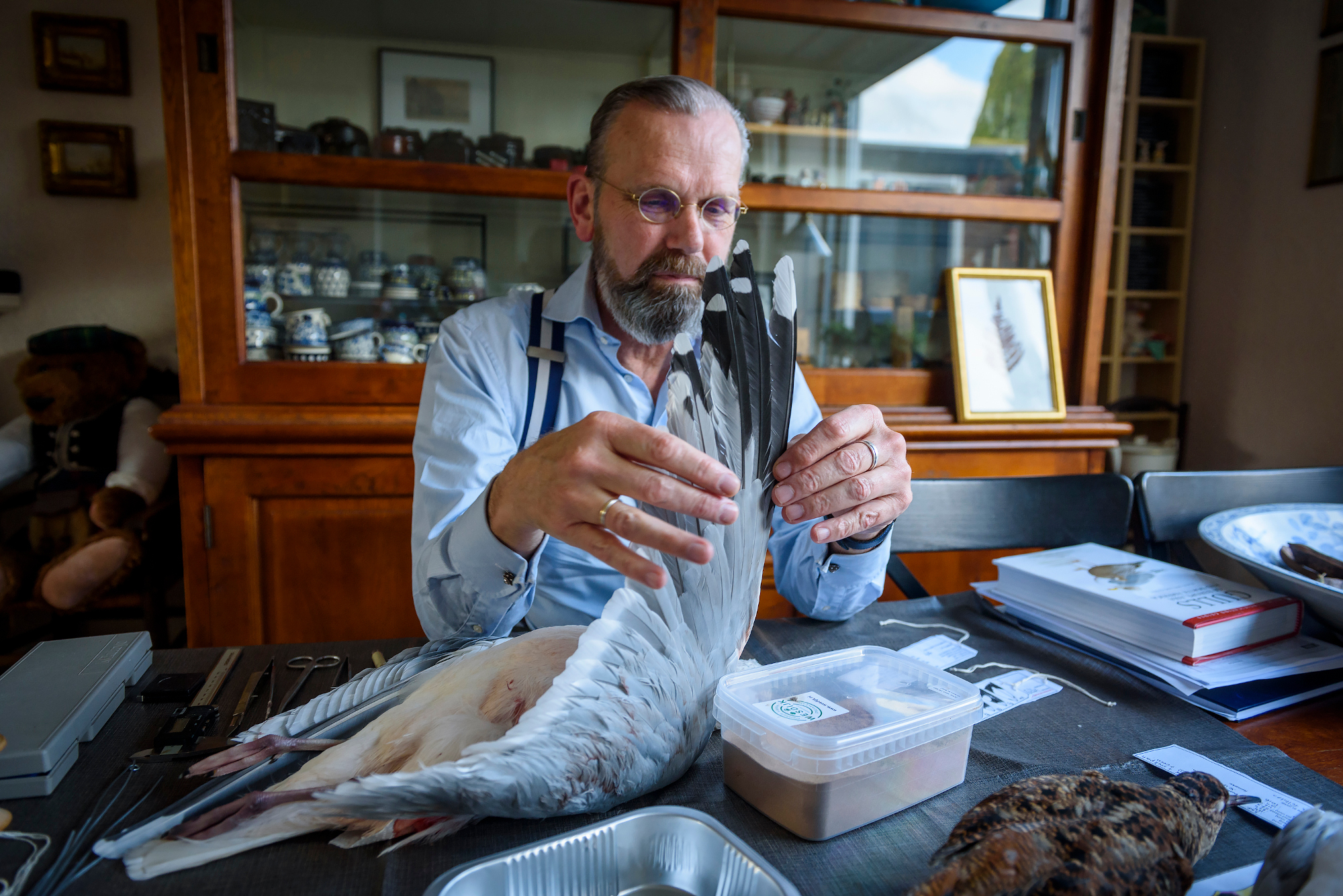 There’s a reason why Kompanje’s wife and son aren’t ruffled by this dining room dissection. He has been making ‘study skins’ (a form of taxidermy in which the animal’s skin is preserved in a stretched pose for easy storage) for years. He emphatically sees himself as a scientific taxidermist: “You also have people who focus on looks. They may even earn a lot of money doing this, but apart from that, they have no interest in the animals whatsoever. It’s different in my case. As a young fellow, I was already very interested in birds. I even had a stint as a commercial taxidermist, because I wanted to earn money to move out of my parents’ place. I borrowed some library books on the subject, read them cover-to-cover a few times and got cracking.”