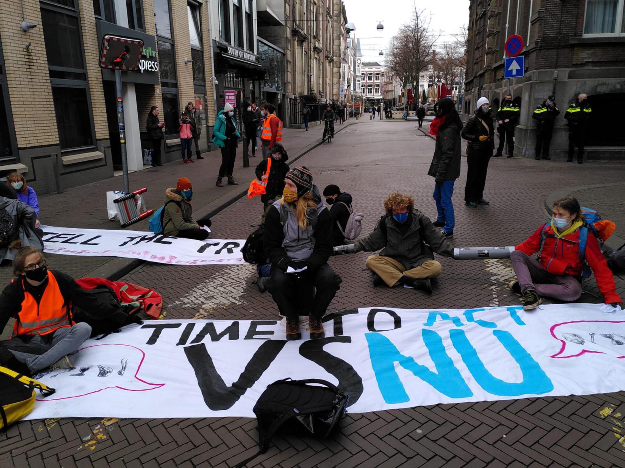 Since 12:00 this afternoon, activists of University Rebellion (UR) have been blocking the VSNU headquarters in The Hague. They have climbed up the facade to hang banners and sing songs, as can be seen on their Instagram stories. Three people are chained (at an appropriate distance) in front of the entrance to the building and another three on the street. “They are also glued to the ground,” says a spokesperson for the movement.