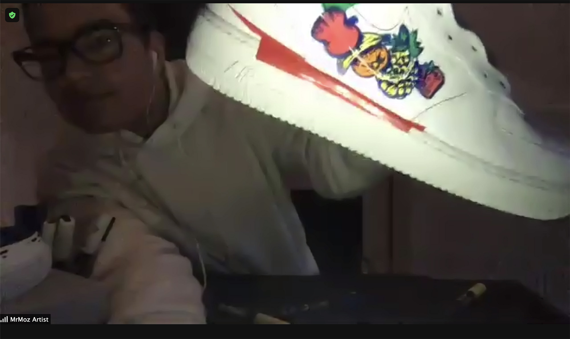 He raised the shoe closer to the camera: “As you can see, the pineapple is almost dry, and I’m almost done with outlining the banana. But maybe you can’t really see it clearly on camera.” He turned on the torchlight on his phone to show the vibrant cartoonish fruits. Participants were impressed: ‘wow’s’ and ‘cool’ popped up in the chat.