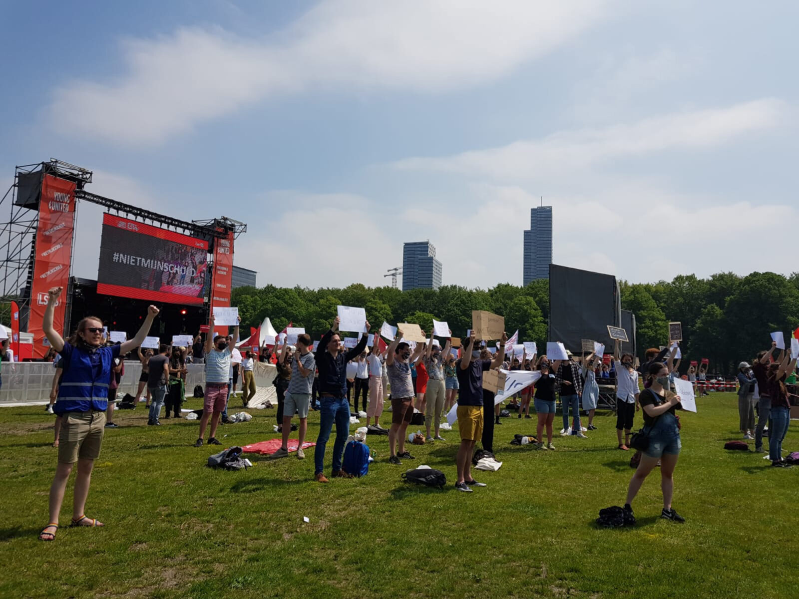 However, it was very quiet on the Malieveld lawn during the spoken-word performance by 19-year-old Amara van der Elst, who also performed at this year’s Remembrance of the Dead commemoration ceremony in Amsterdam’s Dam square. And later, when a song about student grants was sung on stage (‘an ode to a love lost’), people were dancing all over the lawn. Since it was very warm, some people took off their face masks, but social distancing rules were observed at all times.
