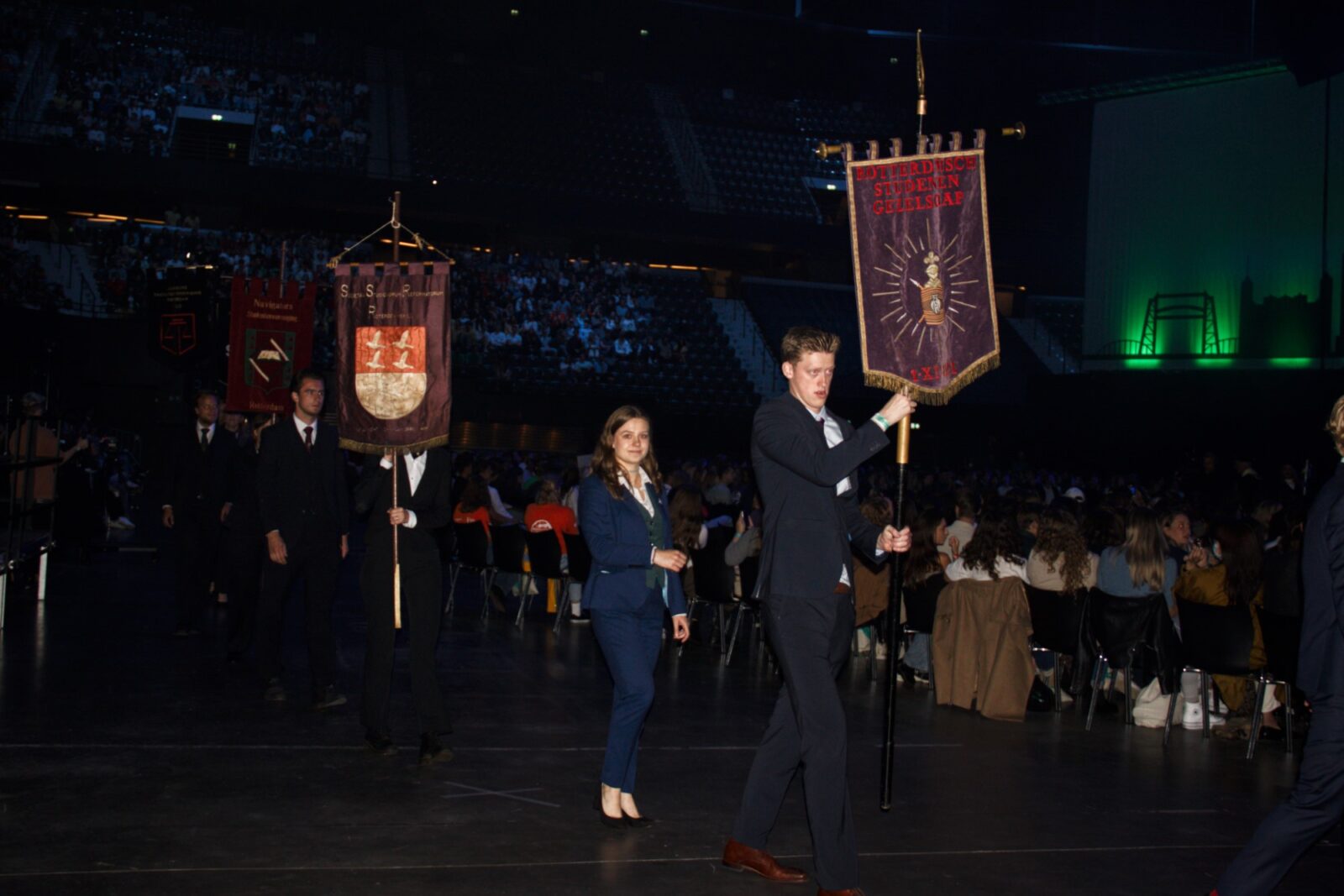 The associations then presented themselves, with choreography by Erasmus Dance Society, the classic Skadi rowing boat and many leaping student association members. A touching video about this year’s charity, the Daniel den Hoed Family House, silenced the hitherto exuberant audience. After Wies and Bo asked the students to make an immediate donation via Tikkie, the first years all reached for their telephones en masse.