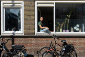 On Genestetplein in Spangen, on the west bank of the Delfshavense Schie, third-year medical student Mees Kommers (22) shares a house with three other students. The evening before, they’d had a party to replace the cancelled festival summer. Fortunately, they didn’t bother the neighbours. “We live in a neighbourhood with only families, and we consider ourselves a bit of a family too. Three young neighbours always like to do things with us, like when we were painting the walls. I think they’re quite intrigued by our student life,” says Mees with a laugh, as the girls watch us from behind the window.