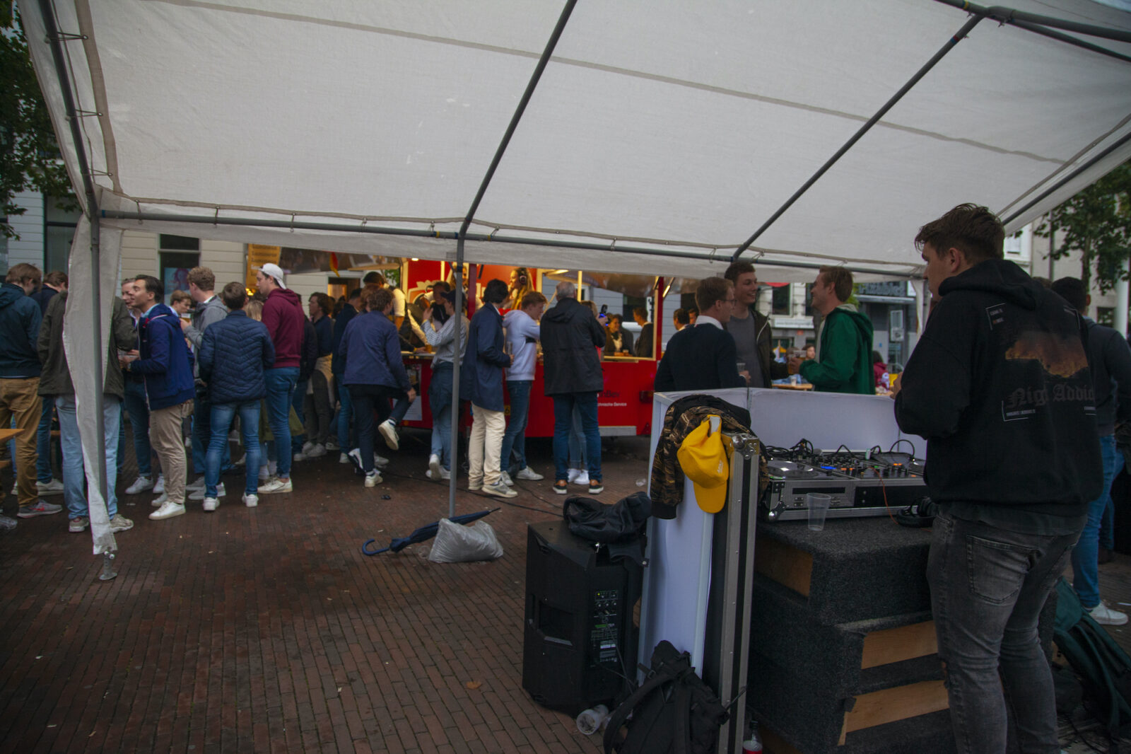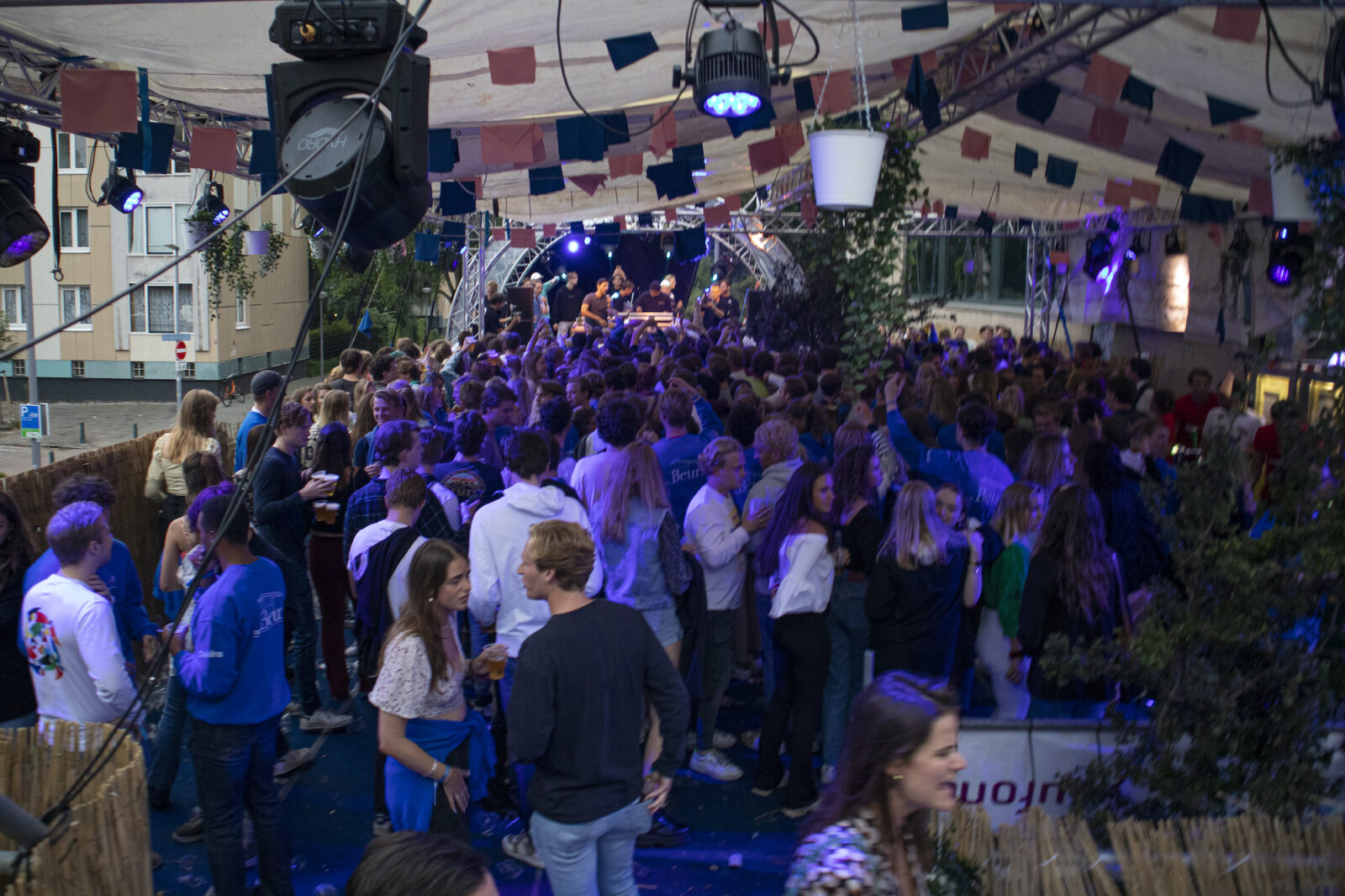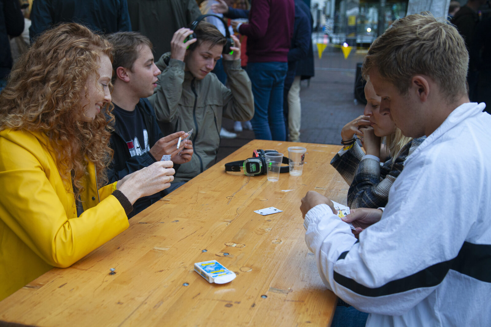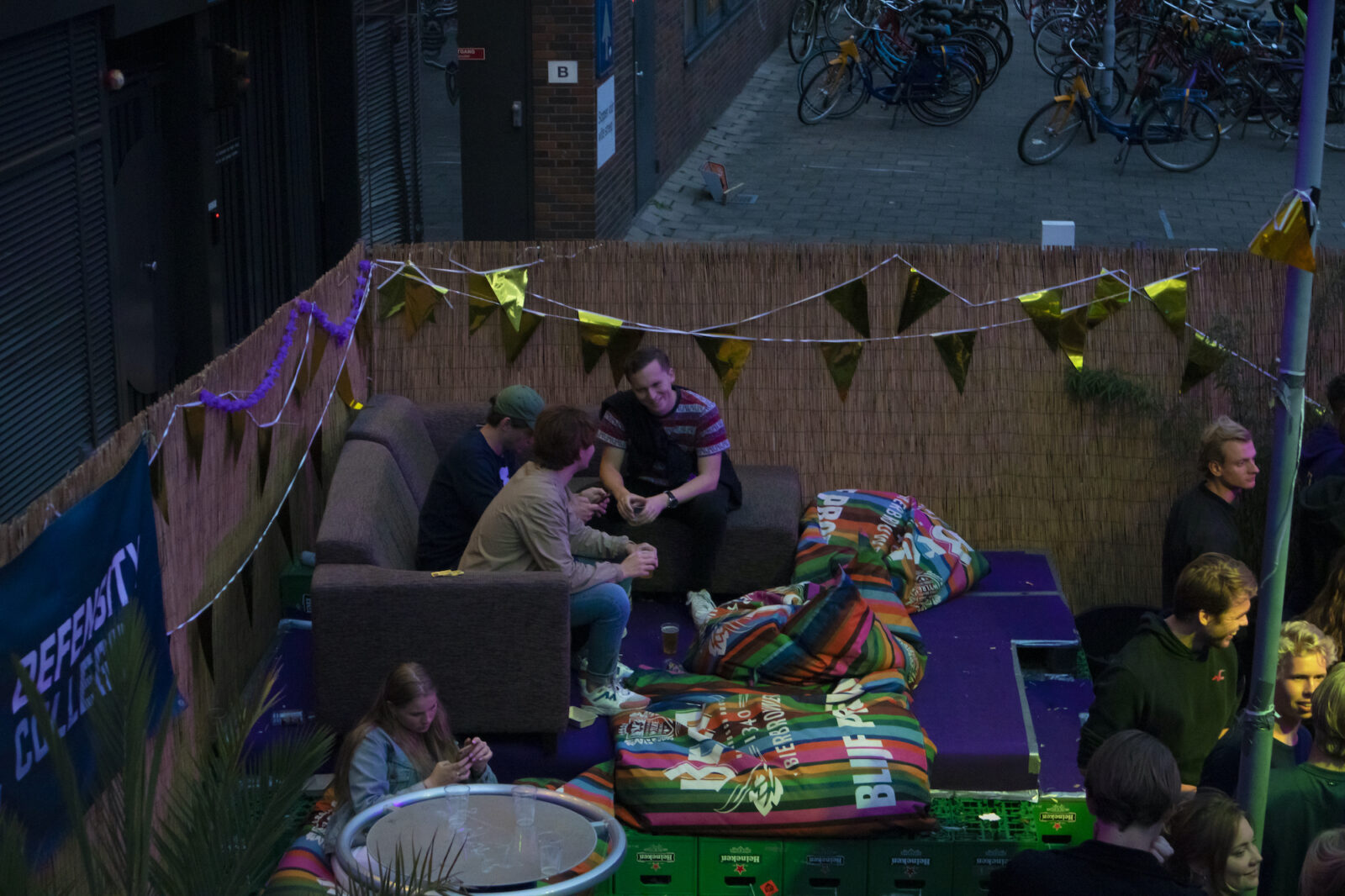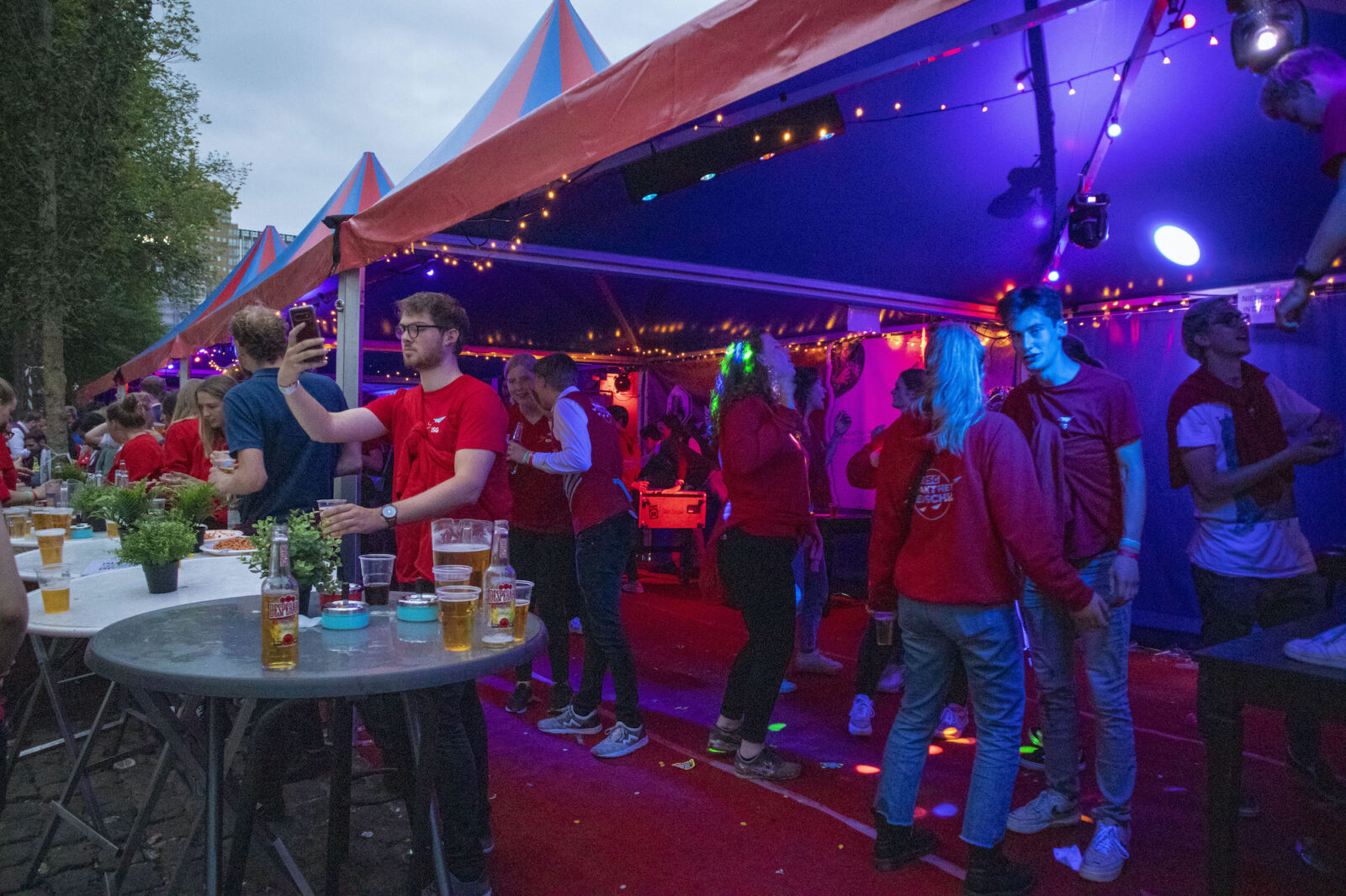 “We don’t need mega DJs to recruit members,” says a member from NSR to photographer Amber. “We always find enough new members.” And the association does indeed get people dancing, because on this silent disco night, a number of visitors go absolutely wild. Elsewhere on the terrace, people are playing cards at a table. The rainy weather is a pity, but what can you do about it?