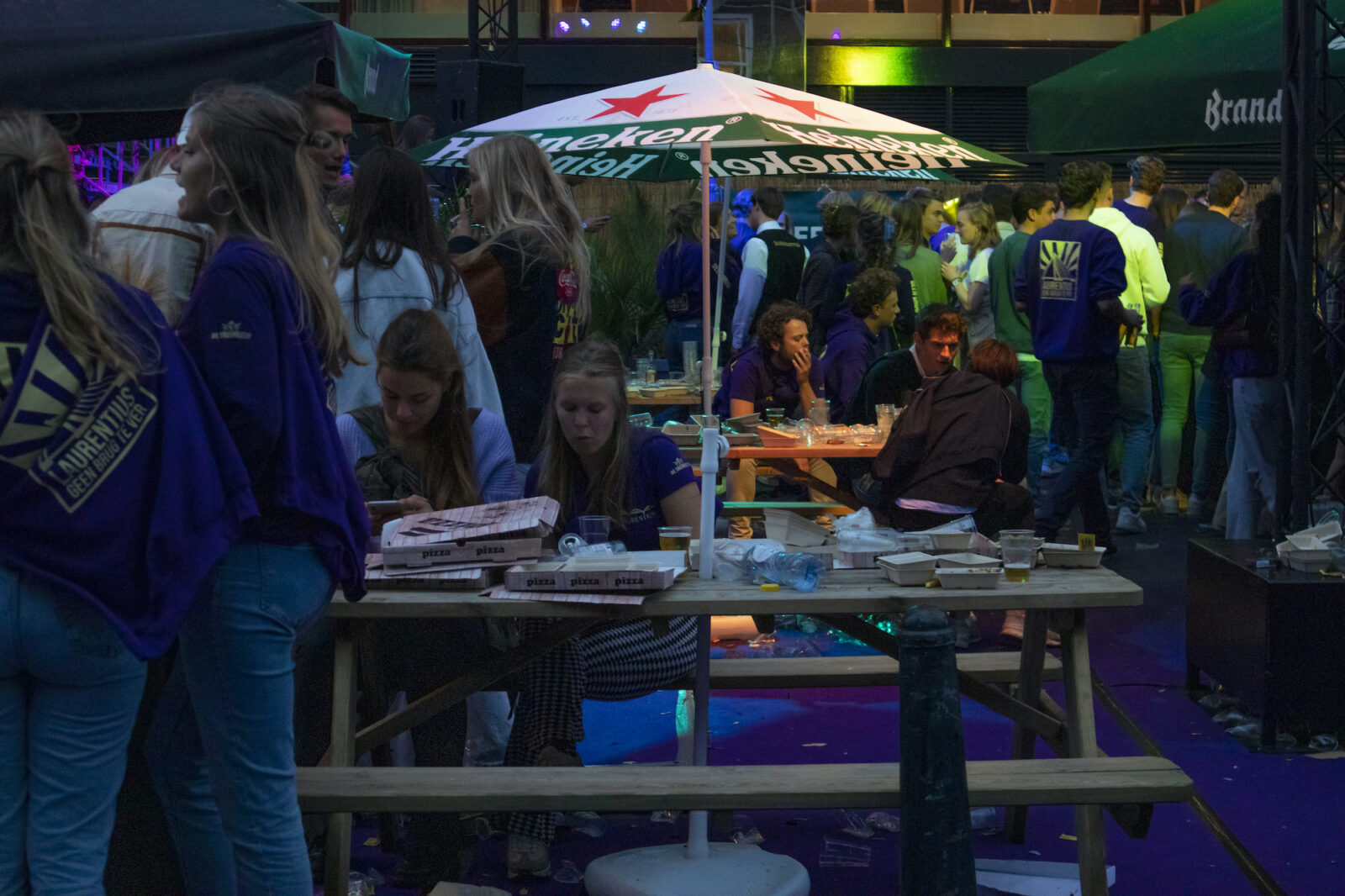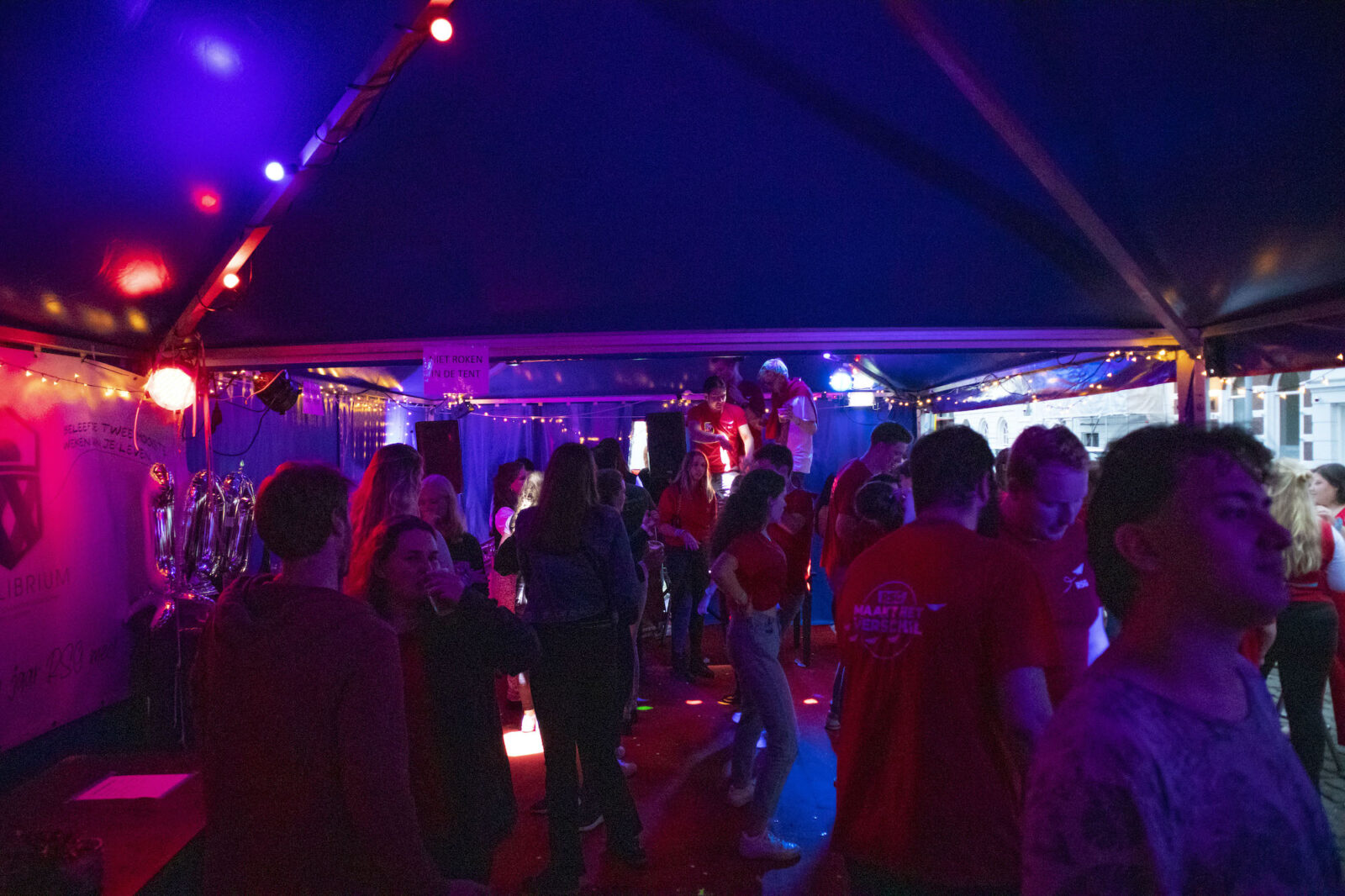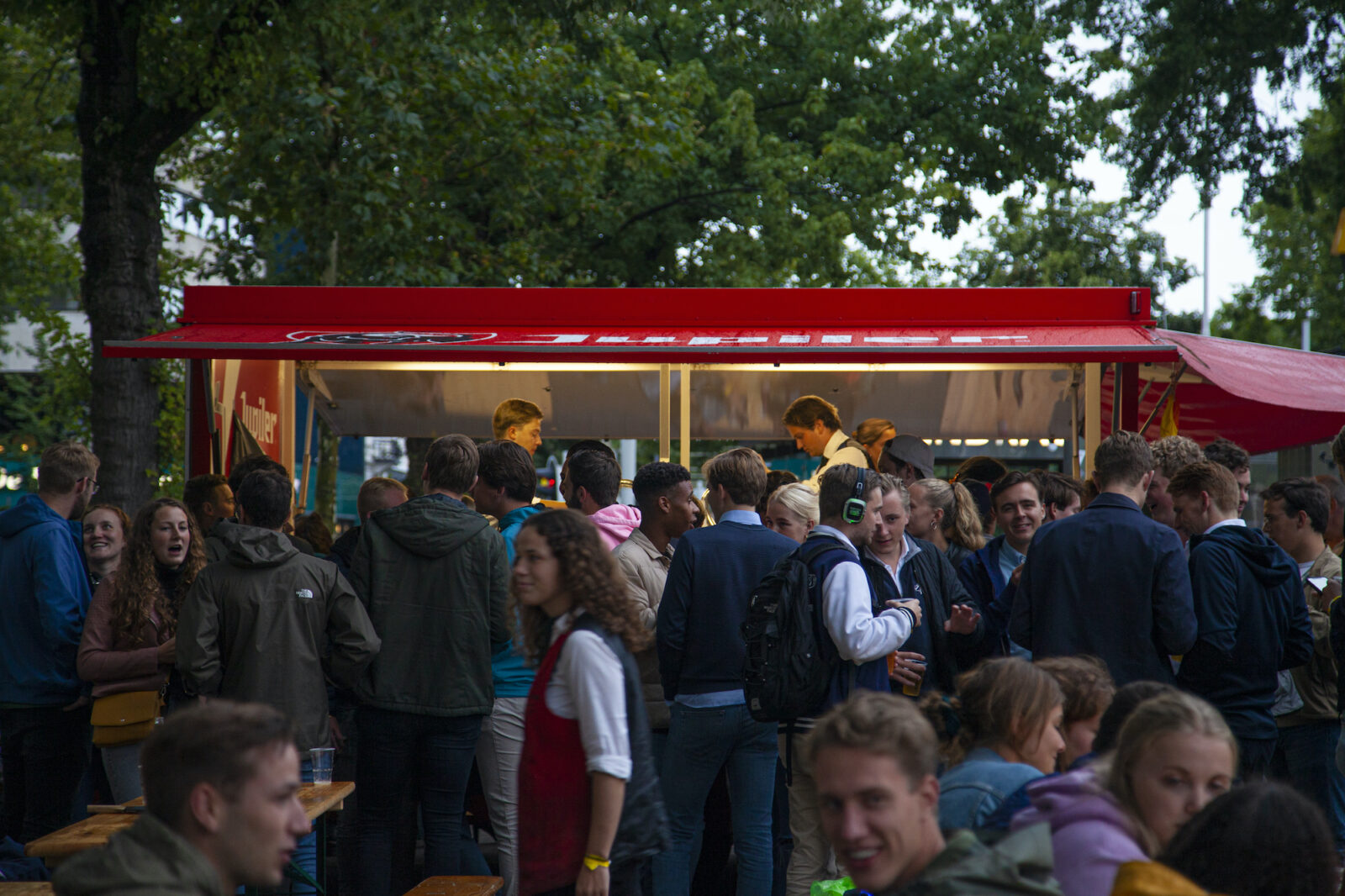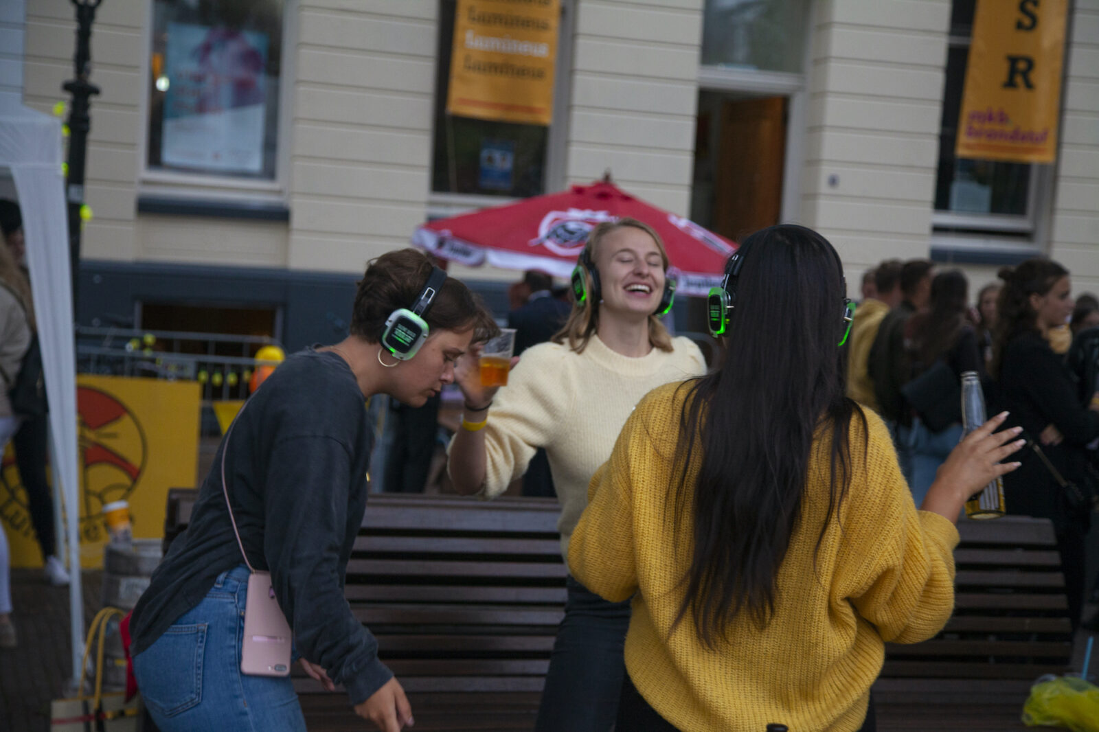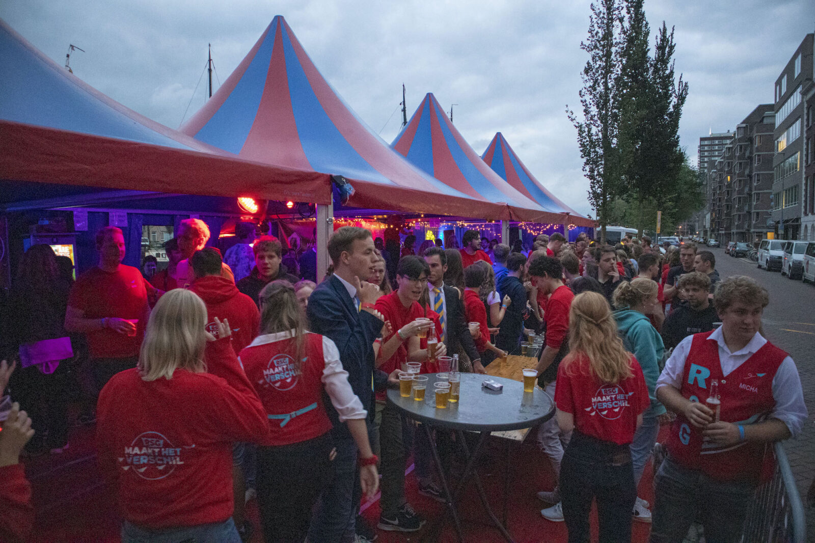 “We don’t need mega DJs to recruit members,” says a member from NSR to photographer Amber. “We always find enough new members.” And the association does indeed get people dancing, because on this silent disco night, a number of visitors go absolutely wild. Elsewhere on the terrace, people are playing cards at a table. The rainy weather is a pity, but what can you do about it?