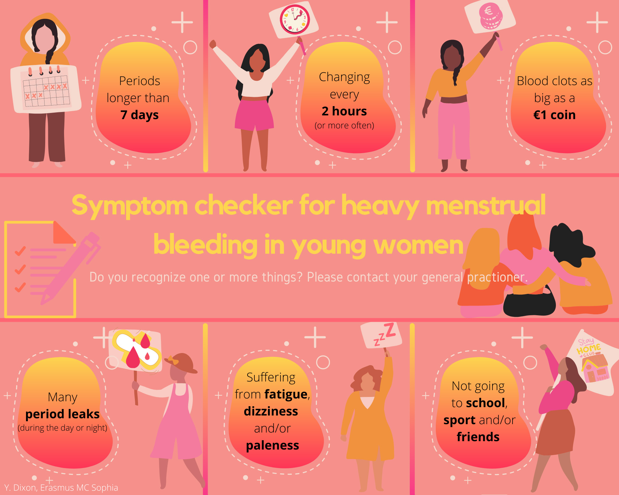 When Dixon wrote her master’s degree thesis on heavy menstrual blood loss, she discovered just how engrained the shame, embarrassment and taboos about heavy periods are. That’s why she produced a symptom checker, which she shared on social media. “Around one in four women have heavy periods, but what is heavy?” stated Dixon. “Supervised by doctors, I tried to produce an objective benchmark. I distributed this on social media and within Erasmus MC, and even the AD newspaper shared it. I also had the checker translated into English, Turkish and Arabic so I could reach as many women as possible.”