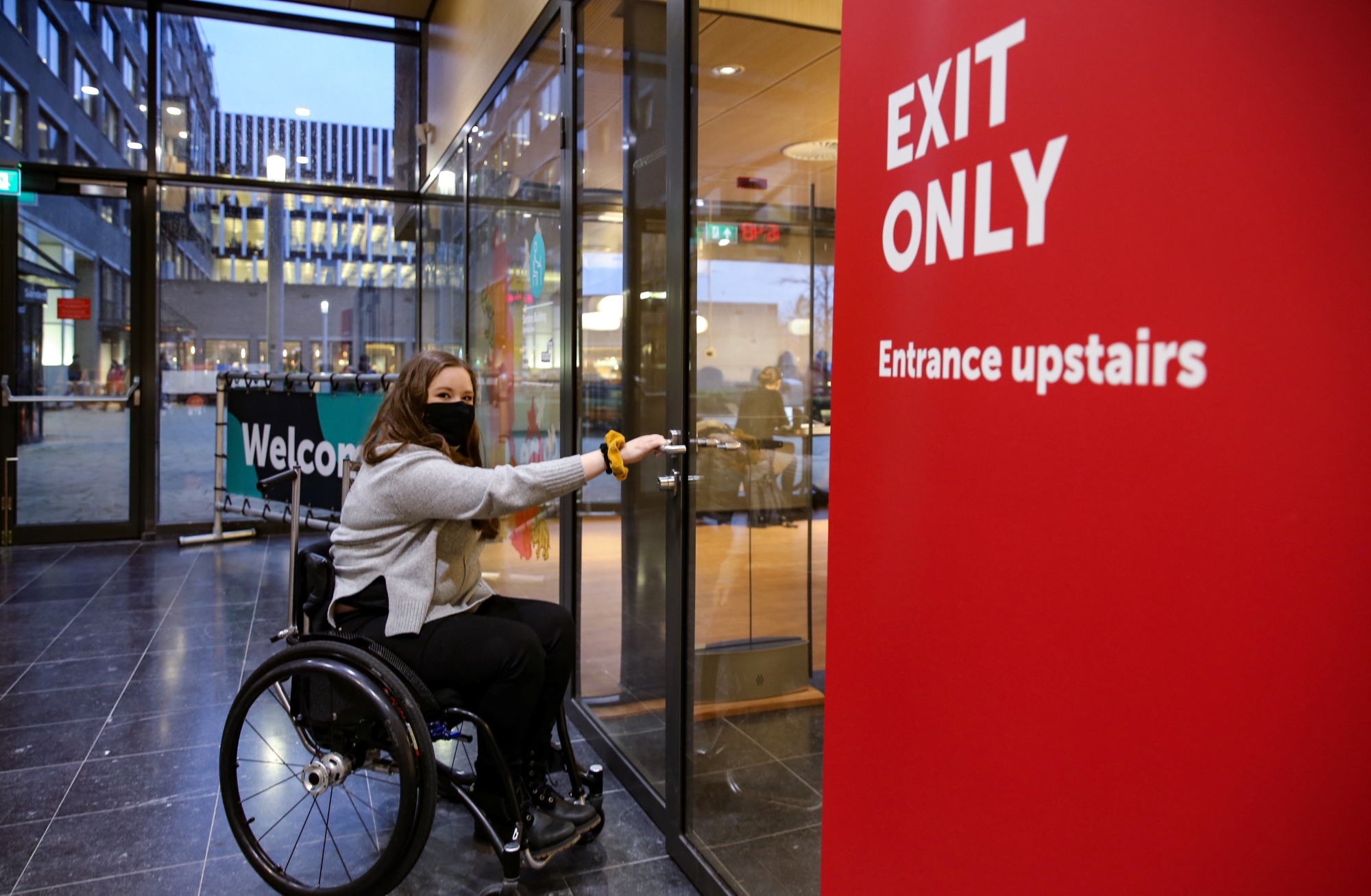 On the way to the Mandeville building, Kyra reckons she got better grades when education was online. “Suddenly it was possible for me to ‘attend’ all my lectures. Physical education is more exhausting, even without the challenges of getting everywhere.” It’s also a problem in the Mandeville building. The pavement rises in front of the entrance, and directly behind it is a revolving door. She has to pick up speed to enter on her own, but often there is a queue in front of the entrance and so it’s not possible. Once again Georgina calf muscles are challenged.